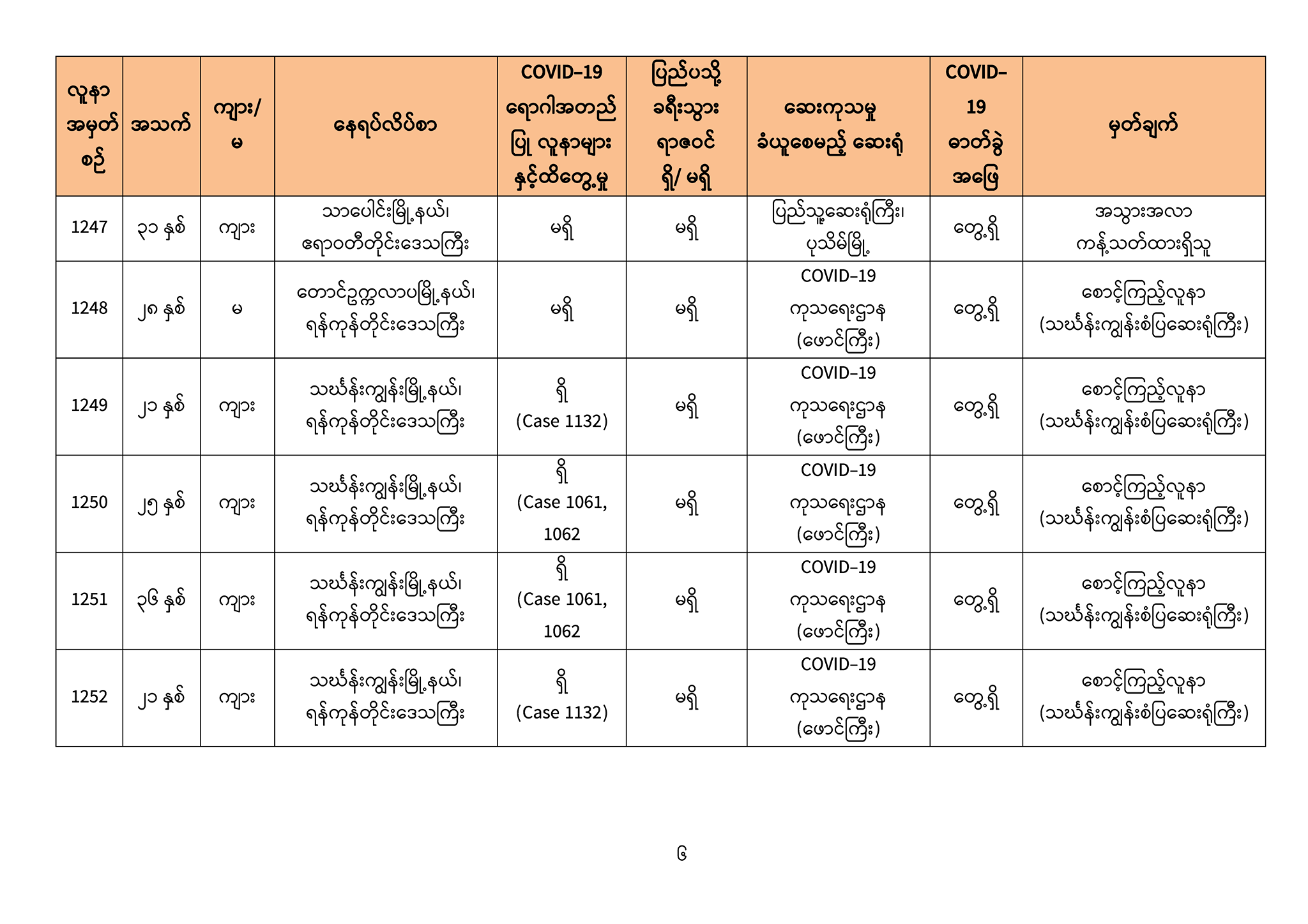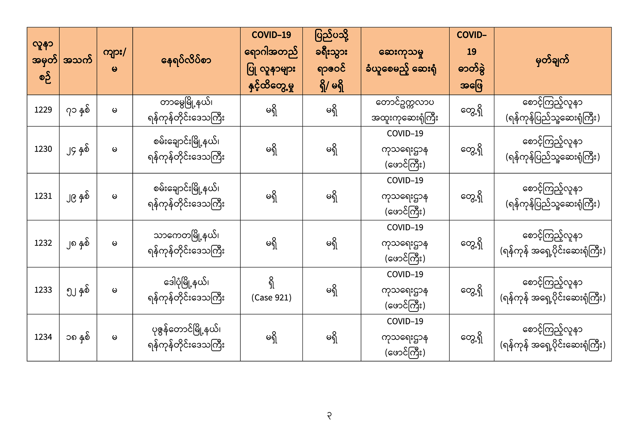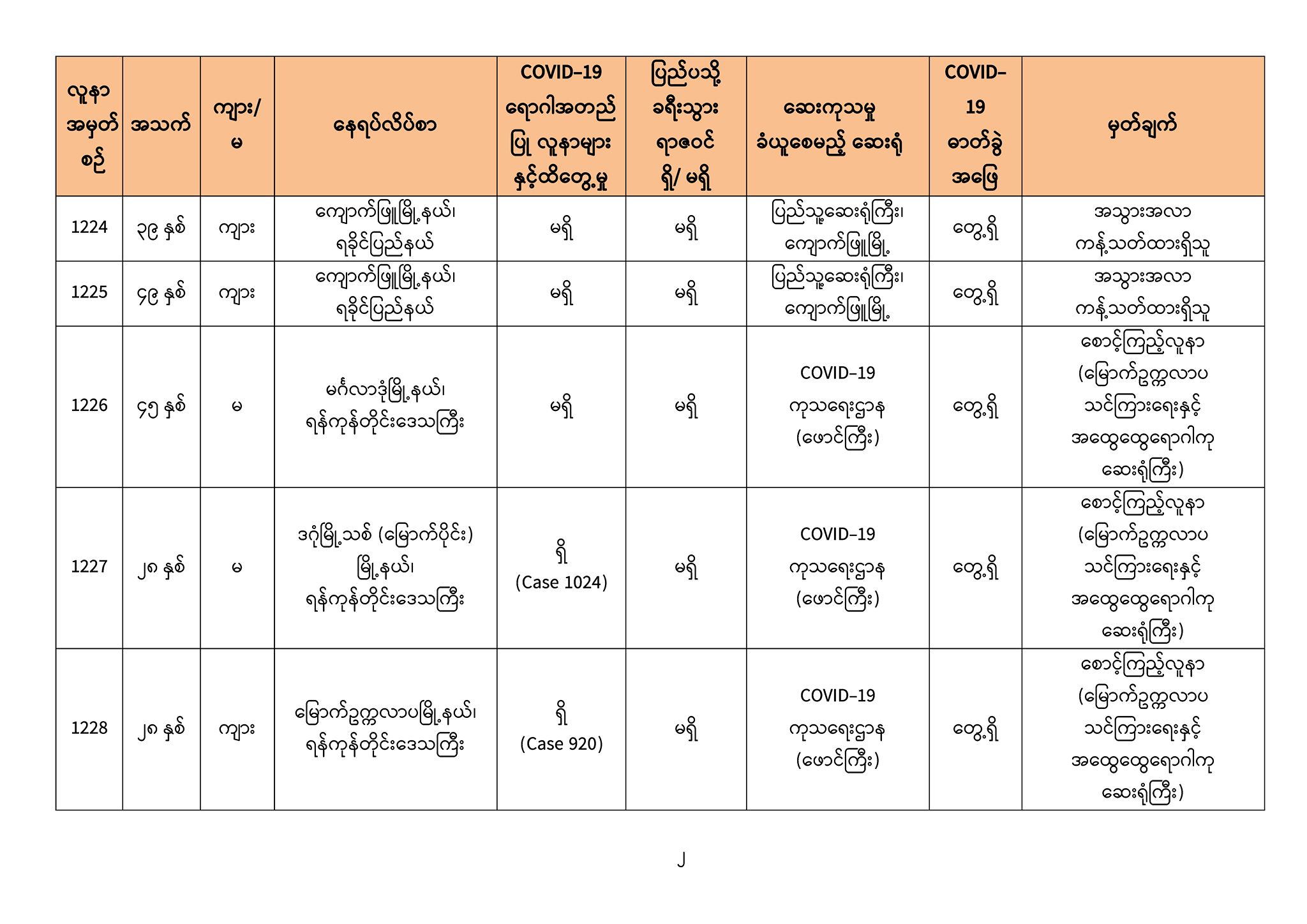 ၃။ ဓာတ်ခွဲအတည်ပြုလူနာသစ်များ၏ သတင်းအချက်အလက်များကို ပူးတွဲပါဇယားများဖြင့် ဖော်ပြအပ်ပါသည်။