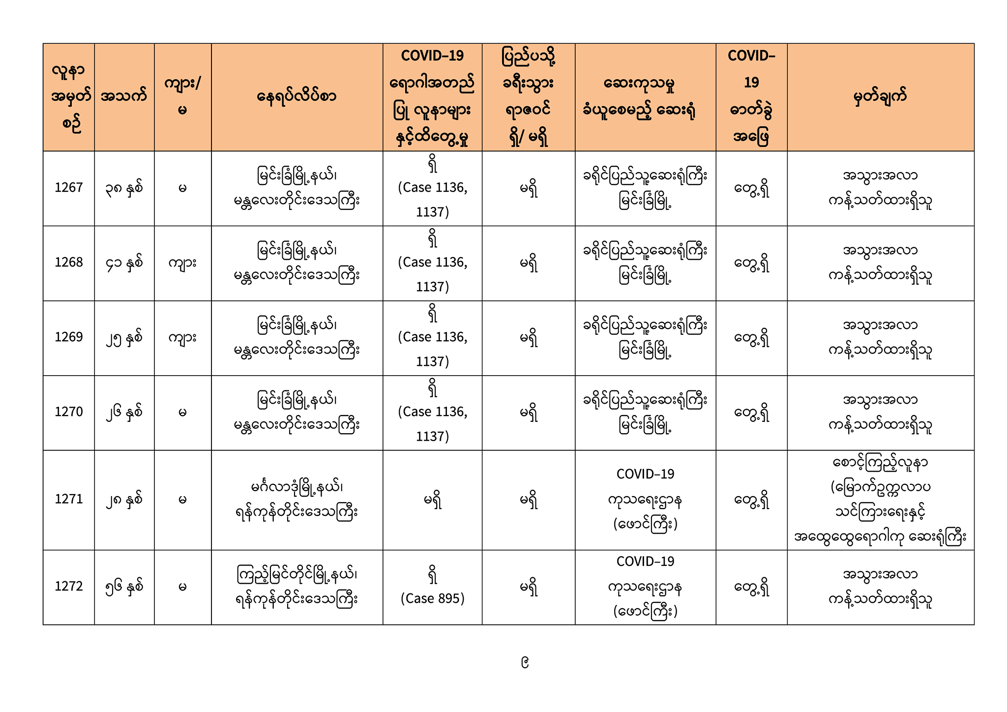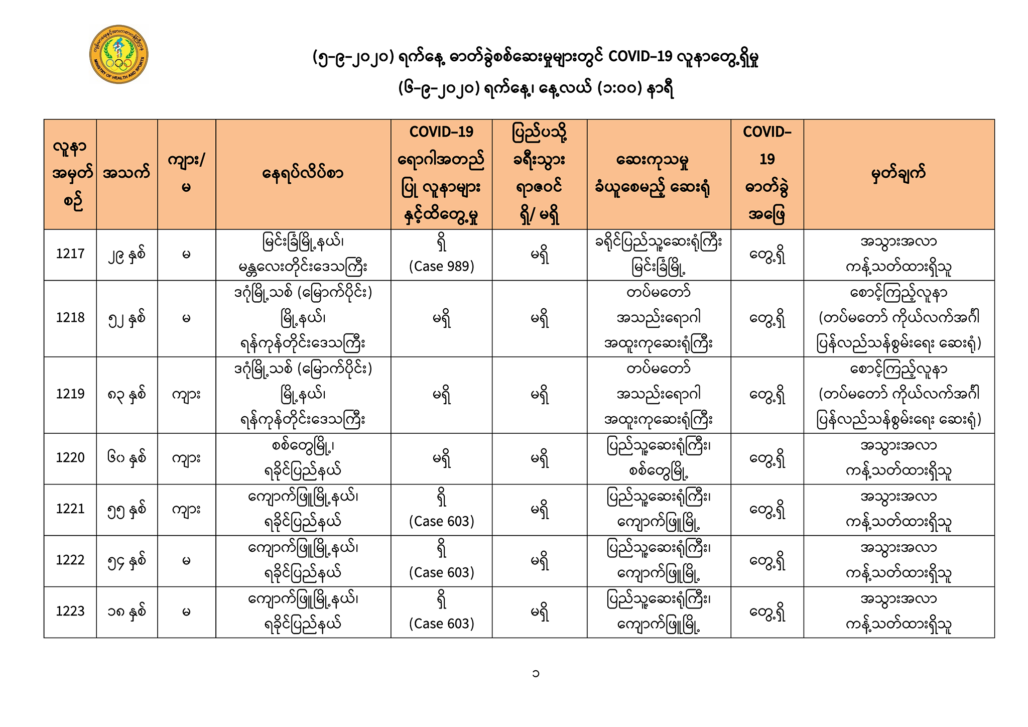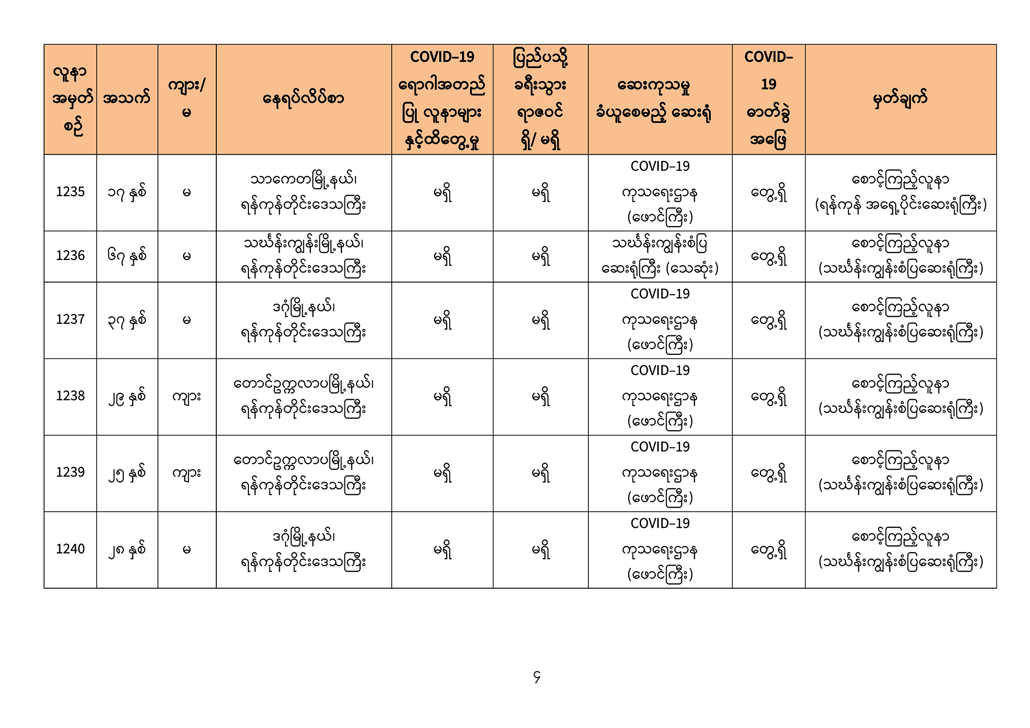 ၁။ (၅-၉ -၂၀၂၀) ရက်နေ့အတွက် COVID-19 ရောဂါ ဓာတ်ခွဲစစ်ဆေးရာတွင် -