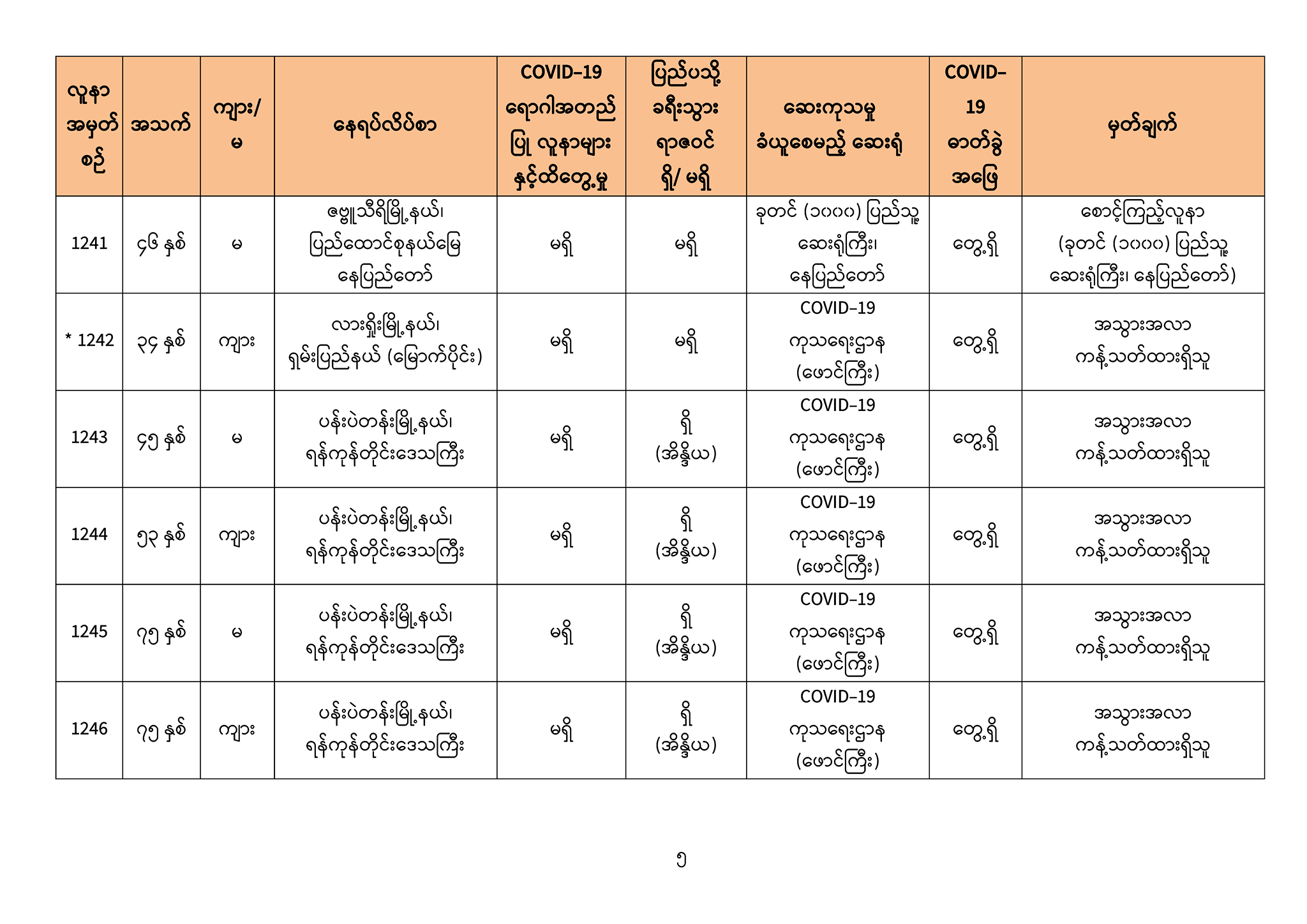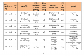 • COVID-19 ရောဂါ ဓာတ်ခွဲအတည်ပြုလူနာသစ် (၁၀၃) ဦး တွေ့ရှိခဲ့ပါသည်။ (အဆိုပါလူနာများ ဓာတ်ခွဲစစ်ဆေးတွေ့ရှိမှုကို ထုတ်ပြန်ခဲ့ပြီးဖြစ်ပါသည်။