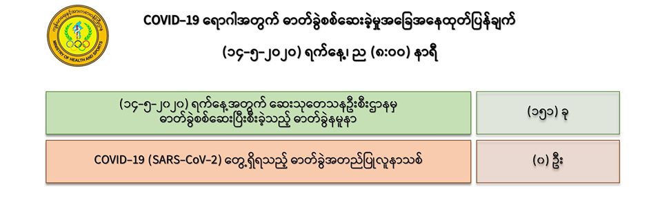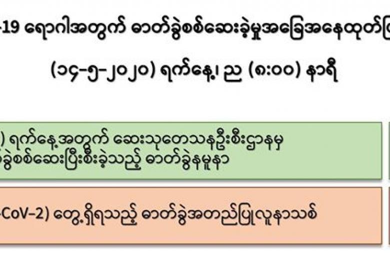 • COVID-19 ရောဂါ ဓာတ်ခွဲအတည်ပြု လူနာသစ် မတွေ့ရှိရပါ။
