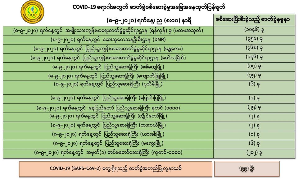 ၁။ (၈-၉ -၂၀၂၀) ရက်နေ့အတွက် COVID-19 ရောဂါ ဓာတ်ခွဲစစ်ဆေးရာတွင် -