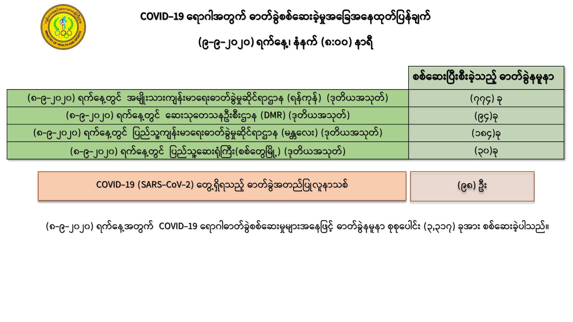 ၁။ (၈-၉ -၂၀၂၀) ရက်နေ့အတွက် COVID-19 ရောဂါ ဓာတ်ခွဲစစ်ဆေးရာတွင် -