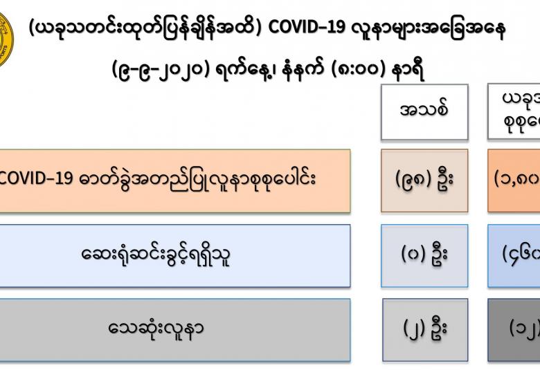 ၃။ သင်္ဃန်းကျွန်းပြည်သူ့ဆေးရုံကြီး၊ရန်ကုန်မြို့တွင် တက်ရောက်ကုသမှုခံယူလျက်ရှိသည့် အသက်(၅၇)နှစ်အရွယ် ဆီးချို၊ သွေးတိုးရောဂါအခံရှိသူ အမျိုးသမီးတစ်ဦး၊ COVID-19 ရောဂါ ဓာတ်ခွဲအတည်ပြုလူနာ (Case – 1692) သည် ပြင်းထန် အဆုတ်ရောင်ရောဂါကြောင့် ရုတ်တရက် အသက်ရှူလမ်းကြောင်း ပျက်စီးခြင်းဖြင့် (၇-၉-၂၀၂၀) ရက်နေ့၊ ညနေ (၄:၀၅) နာရီအချိန် တွင် သေဆုံးခဲ့ပါသည်။