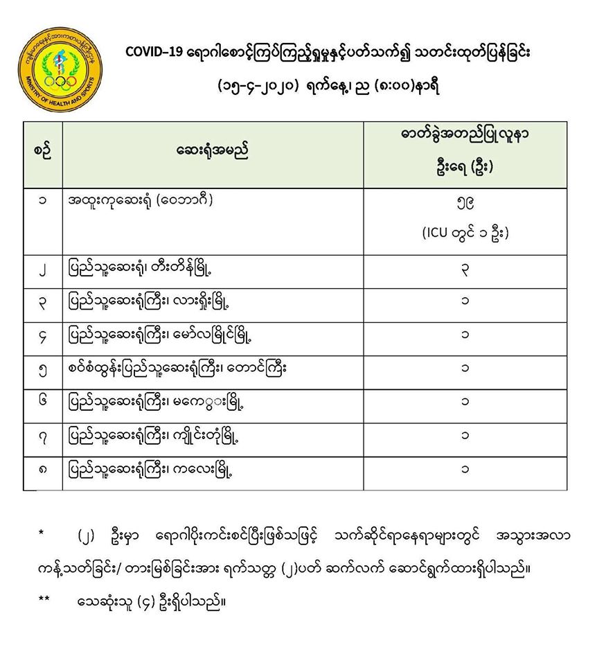 ၂။ COVID-9 ရောဂါ ဓာတ်ခွဲအတည်ပြုလူနာ (၆၈)ဦးအား အောက်ပါဇယားအတိုင်း သက်ဆိုင်ရာဆေးရုံများတွင် လိုအပ်သလို ကုသမှုပေးလျက်ရှိပြီး ၎င်းတို့၏ ကျန်းမာရေးအခြေ အနေမှာ တည်ငြိမ်ကောင်းမွန်လျက်ရှိပါသည်။