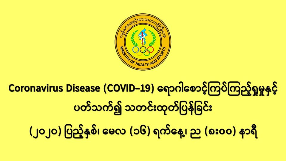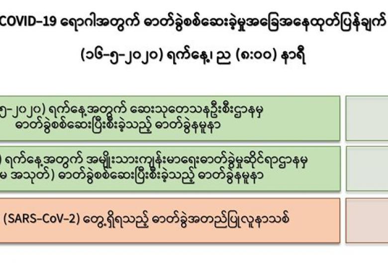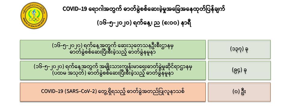 • COVID-19 ရောဂါ ဓာတ်ခွဲအတည်ပြု လူနာသစ် မတွေ့ရှိရပါ။
