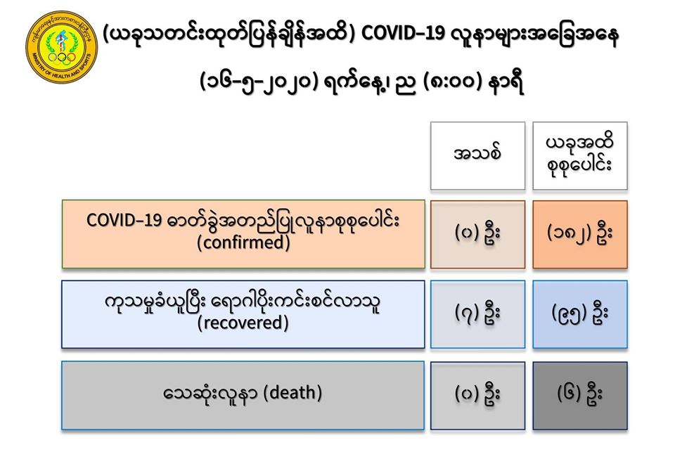 ၃။ ဓာတ်ခွဲအတည်ပြု လူနာဟောင်း (old confirmed case) များ၏ ဓာတ်ခွဲနမူနာများစစ်ဆေးရာတွင် (၂) ကြိမ် ဆက်တိုက် ပိုးမတွေ့ရှိသူ (၇) ဦး (Case - 40, 49, 56, 57, 77, 121 နှင့် 151) ရှိပါသည်။ (၁၆-၅-၂၀၂၀) ရက်နေ့အထိ ရောဂါပိုးကင်းစင်လာသူ စုစုပေါင်း (၉၅) ဦးရှိပါသည်။ ၎င်းတို့အနက် (၈၃) ဦးအား ဆေးရုံမှ ဆင်းခွင့်ပြုခဲ့ပြီးဖြစ်ကာ သတ်မှတ်နေရာများတွင် အသွားအလာကန့်သတ်၍ ဆက်လက်စောင့် ကြပ်ကြည့်ရှုလျက်ရှိပါသည်။