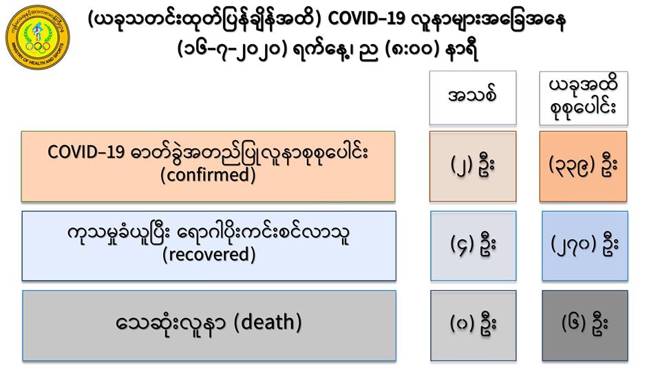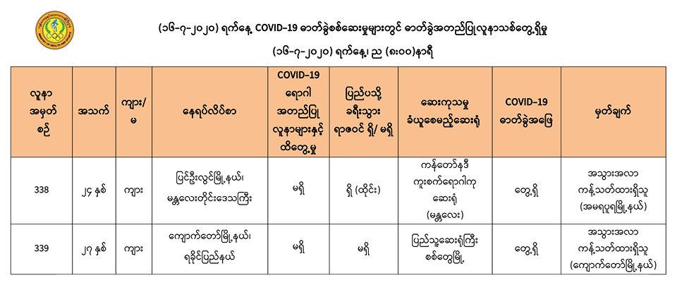 ၂။ (၁၆-၇-၂၀၂၀) ရက်နေ့၊ ည (၈:၀၀)နာရီအထိ မြန်မာနိုင်ငံတွင် COVID-19 ရောဂါဓာတ်ခွဲ အတည်ပြုလူနာ (၃၃၉) ဦးရှိပါသည်။
