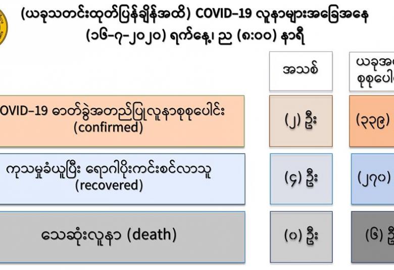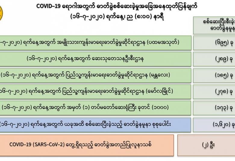 ၁။ (၁၆-၇-၂၀၂၀) ရက်နေ့အတွက် COVID-19 ရောဂါ ဓာတ်ခွဲစစ်ဆေးရာတွင် -