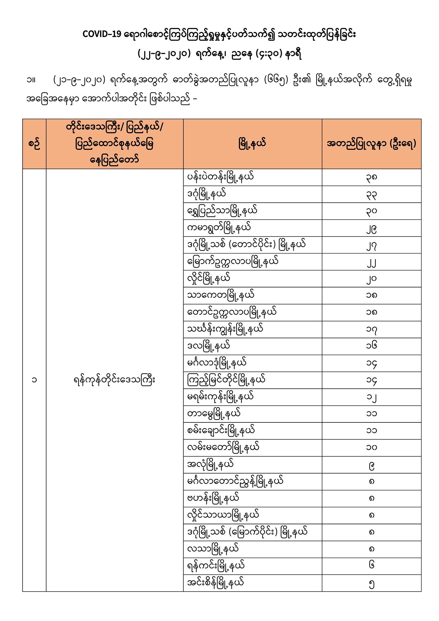 Sep 22,2020 |04:46 | (၂၂-၉-၂၀၂၀) ရက်နေ့၊ ညနေ (၄:၃၀) နာရီ ‗‗‗‗‗‗‗‗‗‗‗‗‗‗‗‗‗‗‗‗‗‗‗‗‗‗‗‗ ၁။ (၂၁-၉-၂၀၂၀) ရက်နေ့အတွက် ဓာတ်ခွဲအတည်ပြုလူနာ (၆၆၅) ဦး၏ မြို့နယ်အလိုက် တွေ့ရှိရမှု အခြေအနေမှာ အောက်ပါအတိုင်း ဖြစ်ပါသည် - #Ministry_of_Health_and_Sports
