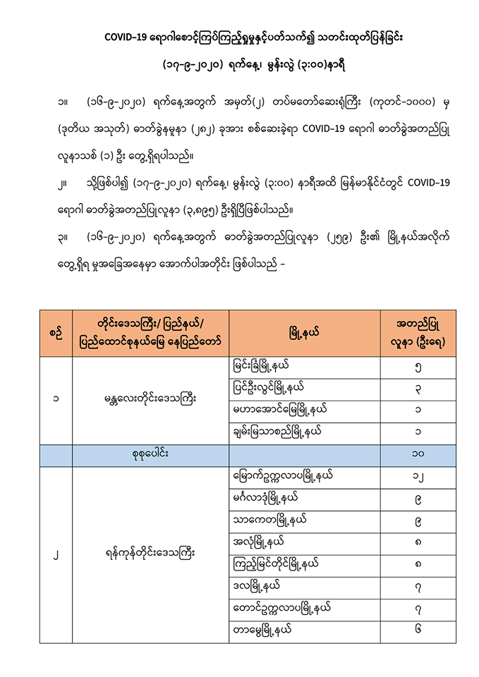 ၁။ ယမန်နေ့ (၁၆-၉-၂၀၂၀) ရက်နေ့ COVID-19 ရောဂါ ဓာတ်ခွဲစစ်ဆေးရာတွင် တွေ့ရှိခဲ့ရသည့် COVID-19 လူနာများတွေ့ရှိမှုအခြေအနေများကို ဖော်ပြအပ်ပါသည်။