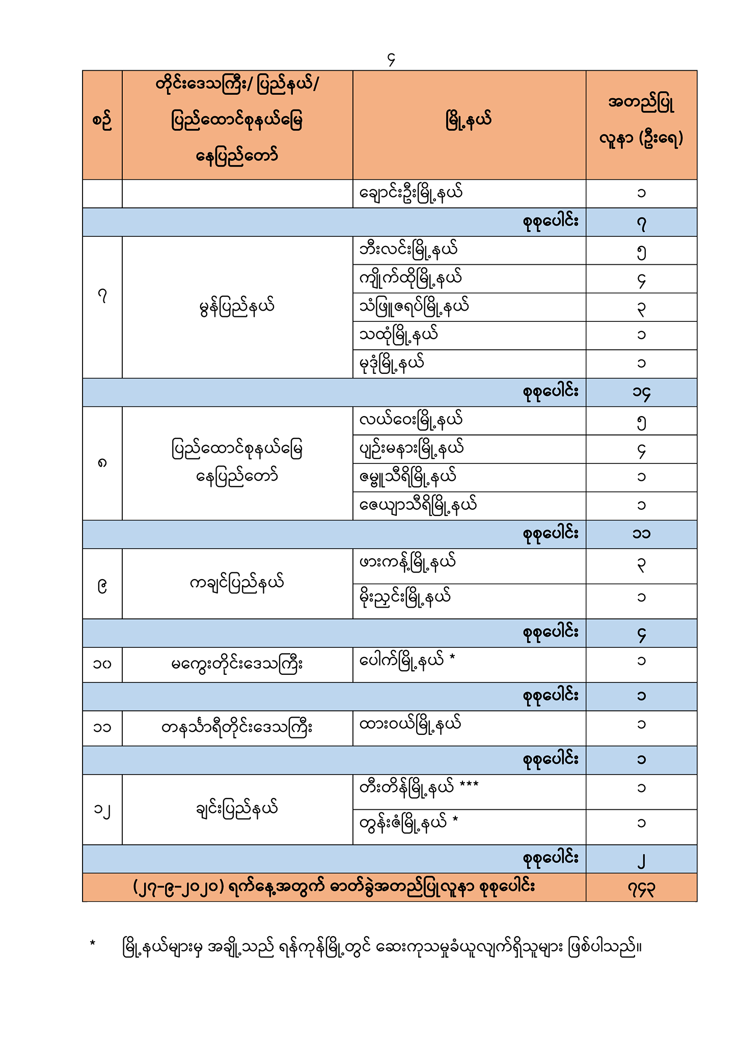 (၂၆-၉-၂၀၂၀) ရက်နေ့၊ ည (၈:၀၀)နာရီမှ (၂၇-၉-၂၀၂၀) ရက်နေ့၊ ည (၈:၀၀)နာရီအတွင်း ဓာတ်ခွဲစစ်ဆေးတွေ့ရှိခဲ့သည့် ဓာတ်ခွဲအတည်ပြုလူနာ (၇၄၃) ဦး၏ မြို့နယ်အလိုက် တွေ့ရှိရမှု အခြေအနေမှာ အောက်ပါအတိုင်း ဖြစ်ပါသည် -