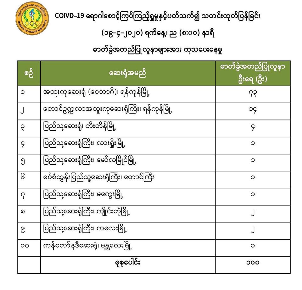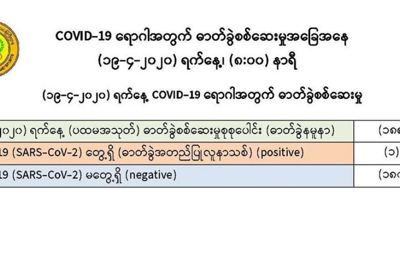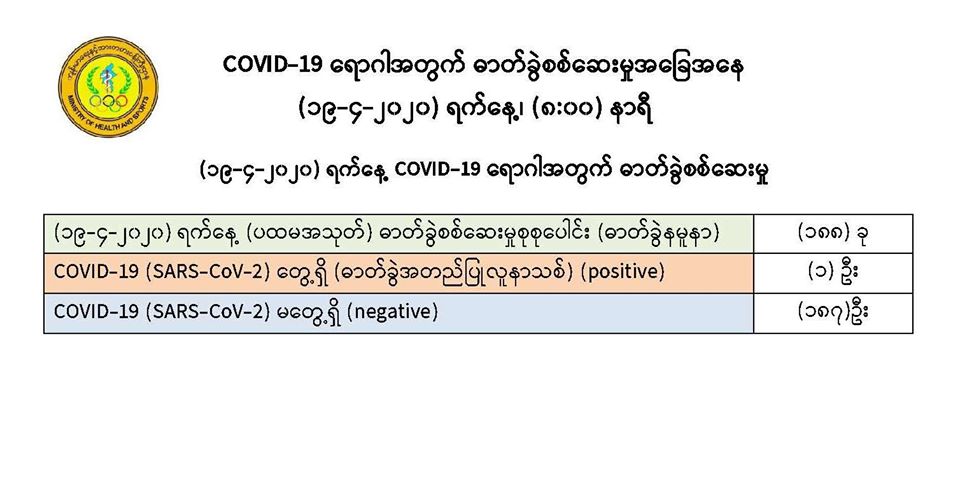 ၁။ အမျိုးသားကျန်းမာရေးဓာတ်ခွဲမှုဆိုင်ရာဌာန (ရန်ကုန်) ၏ (၁၉-၄-၂၀၂၀) ရက်နေ့ ပထမအသုတ်စစ်ဆေးခဲ့သော ဓာတ်ခွဲနမူနာ (၁၈၈) ခုအနက် (၁) ဦးတွင် COVID-19 ရောဂါပိုး တွေ့ရှိ (တွေ့ရှိ) ရပြီး ကျန်လူနာ (၁၈၇) ဦးတွင် COVID-19 ရောဂါ ပိုးမတွေ့ရှိ (မတွေ့ရှိ) ပါ။