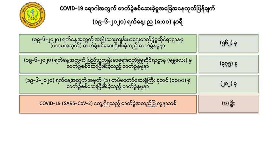 ၁။ (၁၉-၆-၂၀၂၀) ရက်နေ့အတွက် COVID-19 ရောဂါ ဓာတ်ခွဲစစ်ဆေးရာတွင် -