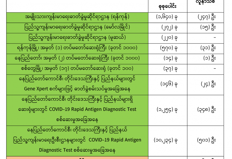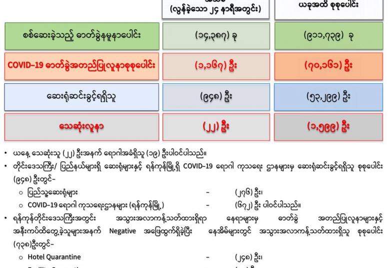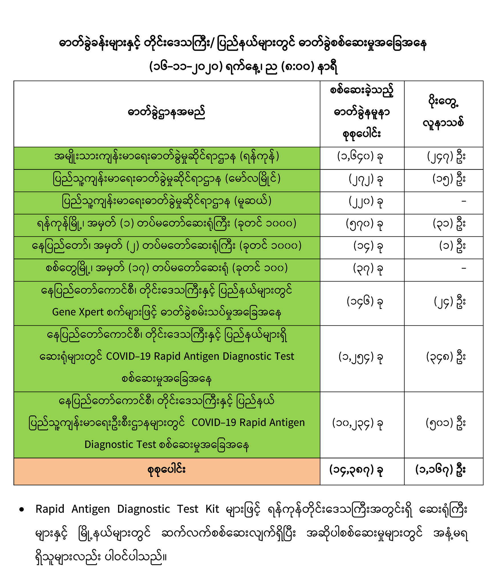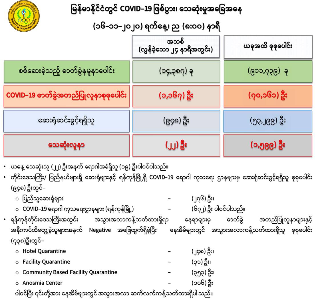 (၁၅-၁၁-၂၀၂၀) ရက်နေ့၊ ည (၈:၀၀) နာရီမှ (၁၆-၁၁-၂၀၂၀) ရက်နေ့၊ ည (၈:၀၀) နာရီ အတွင်း ဓာတ်ခွဲနမူနာ စုစုပေါင်း (၁၄,၃၈၇) ခုအား စစ်ဆေးပြီးစီးခဲ့ရာ COVID-19 ရောဂါ ဓာတ်ခွဲအတည်ပြု လူနာသစ် (၁,၁၆၇) ဦး တွေ့ရှိရပါသည်။