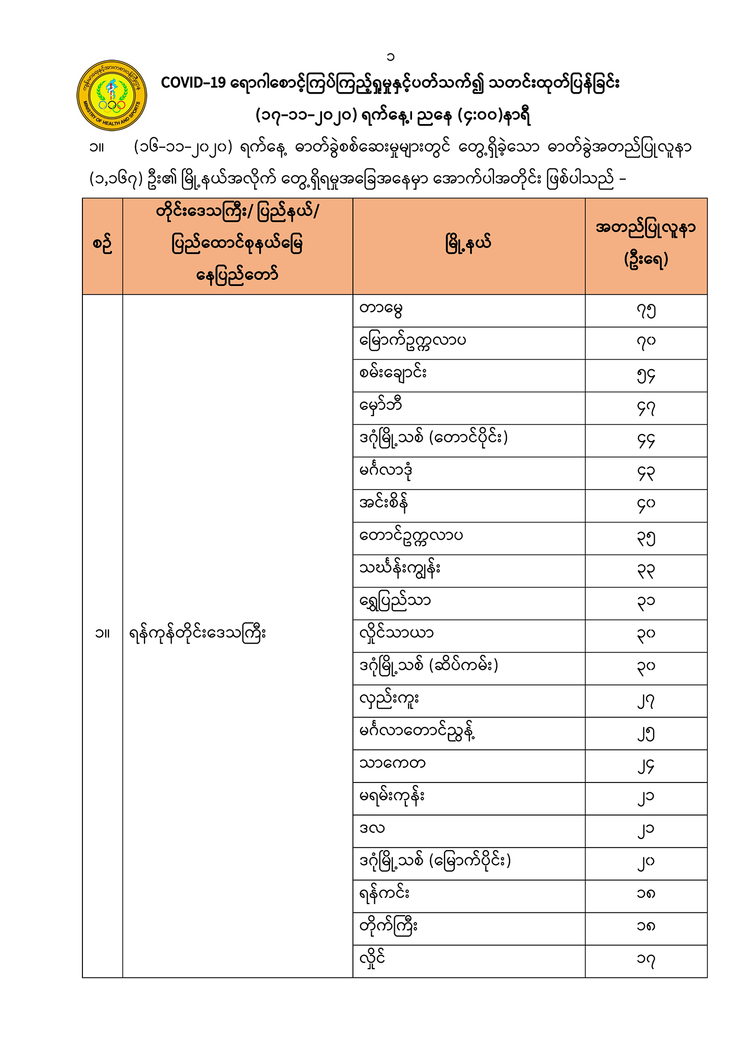 Nov 17,2020 |04:28 | (၁၇-၁၁-၂၀၂၀) ရက်နေ့၊ ညနေ (၄:၀၀)နာရီ ‗‗‗‗‗‗‗‗‗‗‗‗‗‗‗‗‗‗‗‗‗‗‗‗‗‗‗‗ (၁၆-၁၁-၂၀၂၀) ရက်နေ့ ဓာတ်ခွဲစစ်ဆေးမှုများတွင် တွေ့ရှိခဲ့သော ဓာတ်ခွဲအတည်ပြုလူနာ (၁,၁၆၇) ဦး၏ မြို့နယ်အလိုက် တွေ့ရှိရမှုအခြေအနေမှာ အောက်ပါအတိုင်း ဖြစ်ပါသည်။ #Ministry_of_Health_and_Sports