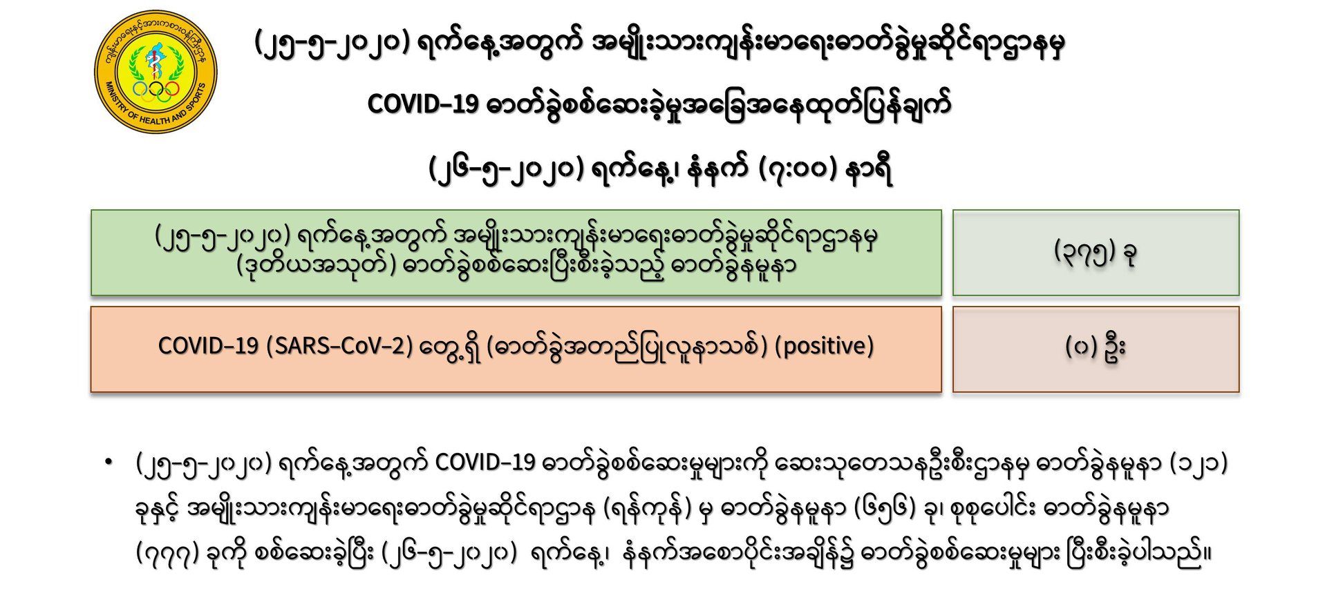 ၁။ (၂၅-၅-၂၀၂၀) ရက်နေ့အတွက် COVID-19 ဓာတ်ခွဲစစ်ဆေးမှုများတွင် ဆေးသုတေသနဦးစီးဌာနမှ ဒုတိယအသုတ်အဖြစ် ဓာတ်ခွဲနမူနာ (၃၇၅) ခု အား (၂၆-၅-၂၀၂၀) ရက်နေ့၊ နံနက်အစောပိုင်းတွင် စစ်ဆေးပြီးစီးခဲ့ရာ -
