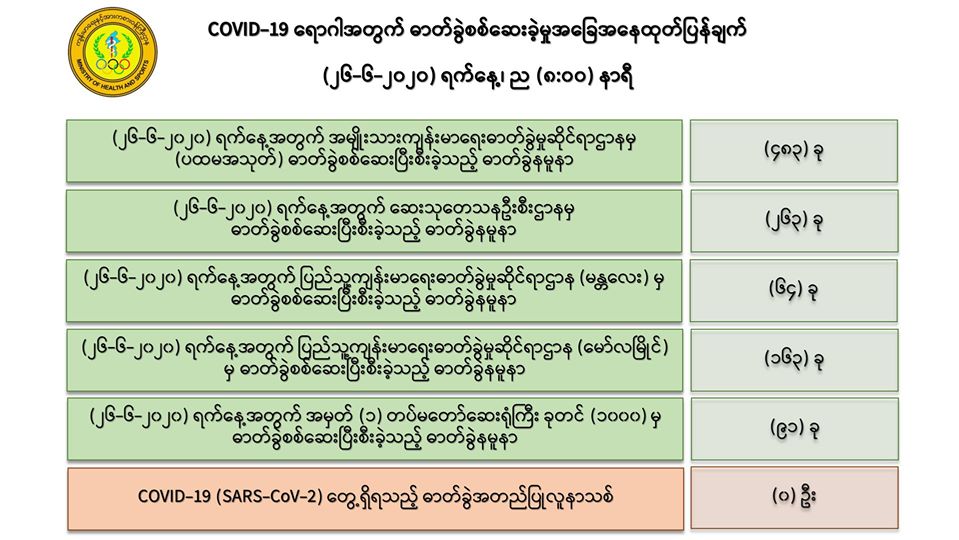 ၁။ (၂၆-၆-၂၀၂၀) ရက်နေ့အတွက် COVID-19 ရောဂါ ဓာတ်ခွဲစစ်ဆေးရာတွင် -