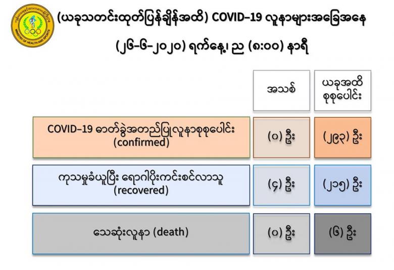 ၂။ (၂၆-၆-၂၀၂၀) ရက်နေ့၊ ည (၈:၀၀)နာရီအထိ မြန်မာနိုင်ငံတွင် COVID-19 ရောဂါဓာတ်ခွဲ အတည်ပြုလူနာ (၂၉၃) ဦးရှိပါသည်။