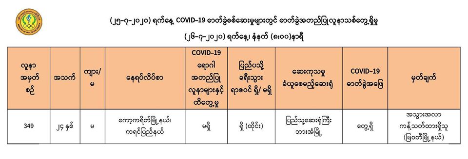 ၂။ (၂၆-၇-၂၀၂၀) ရက်နေ့၊ နံနက် (၈:၀၀)နာရီအထိ မြန်မာနိုင်ငံတွင် COVID-19 ရောဂါဓာတ်ခွဲ အတည်ပြုလူနာ (၃၄၉) ဦးရှိပြီဖြစ်ပါသည်။
