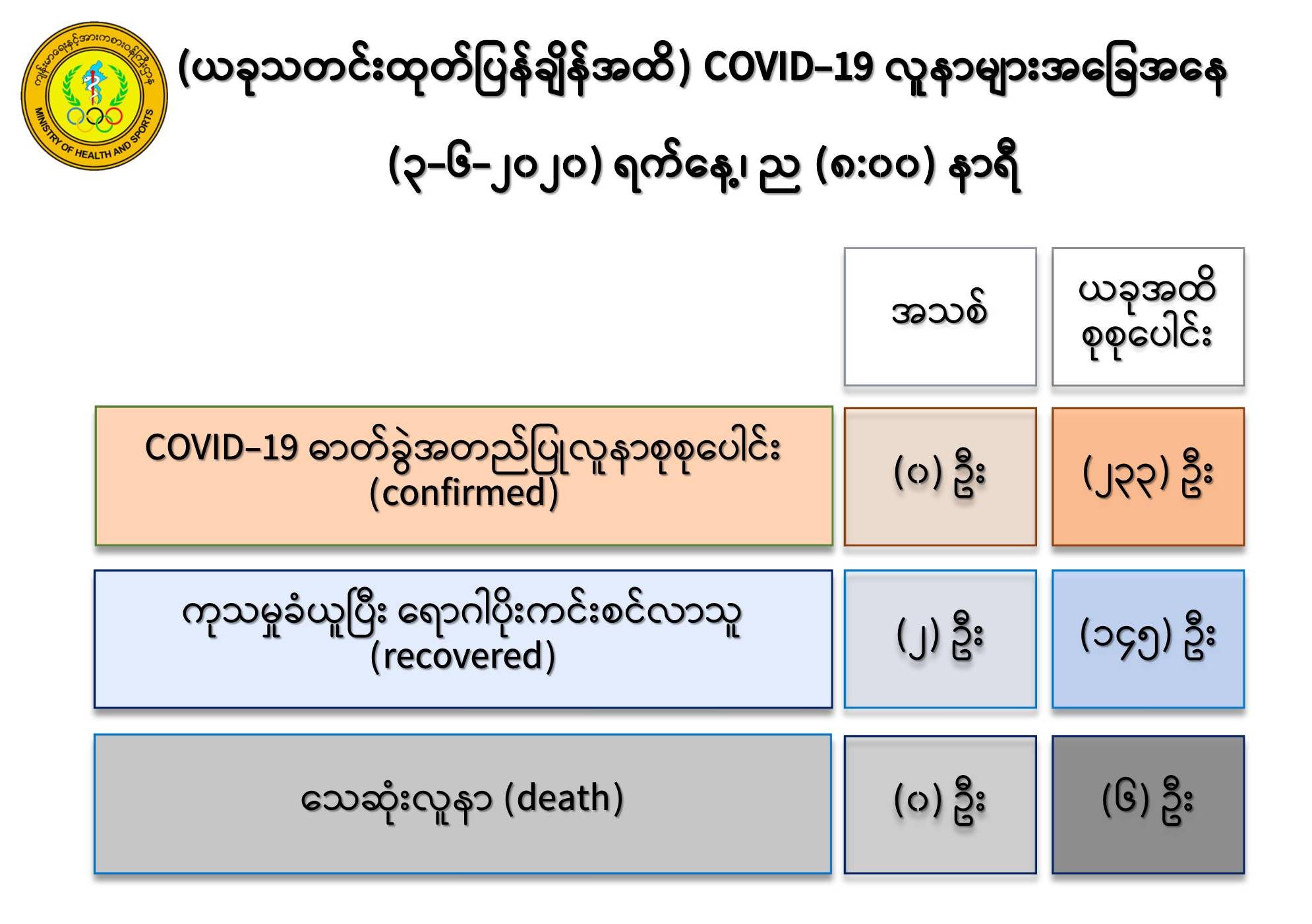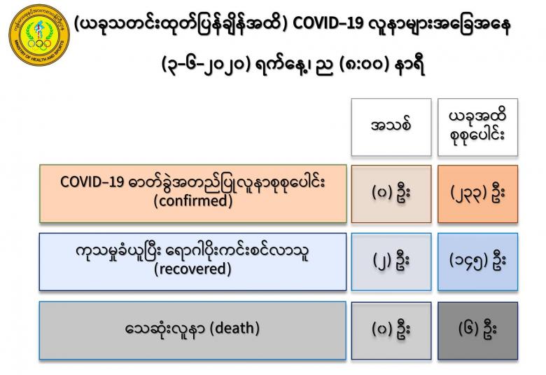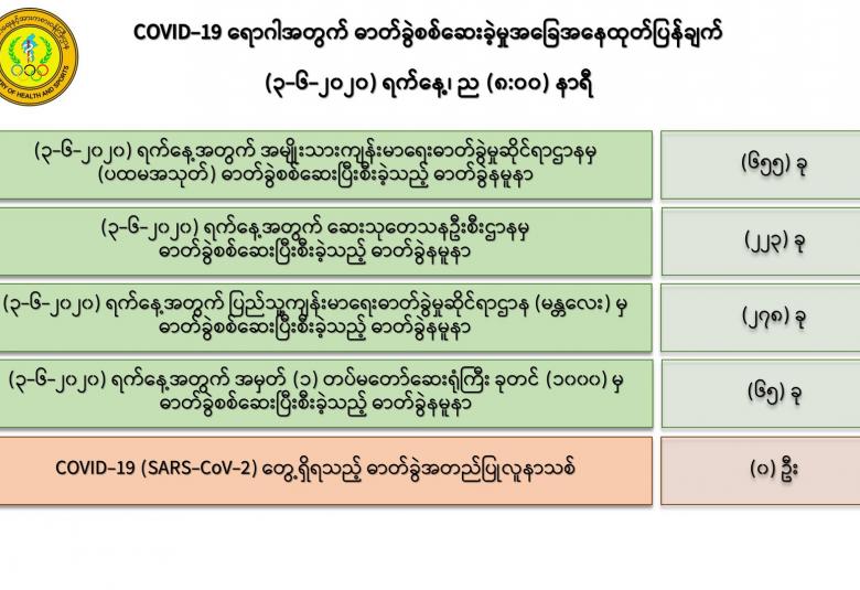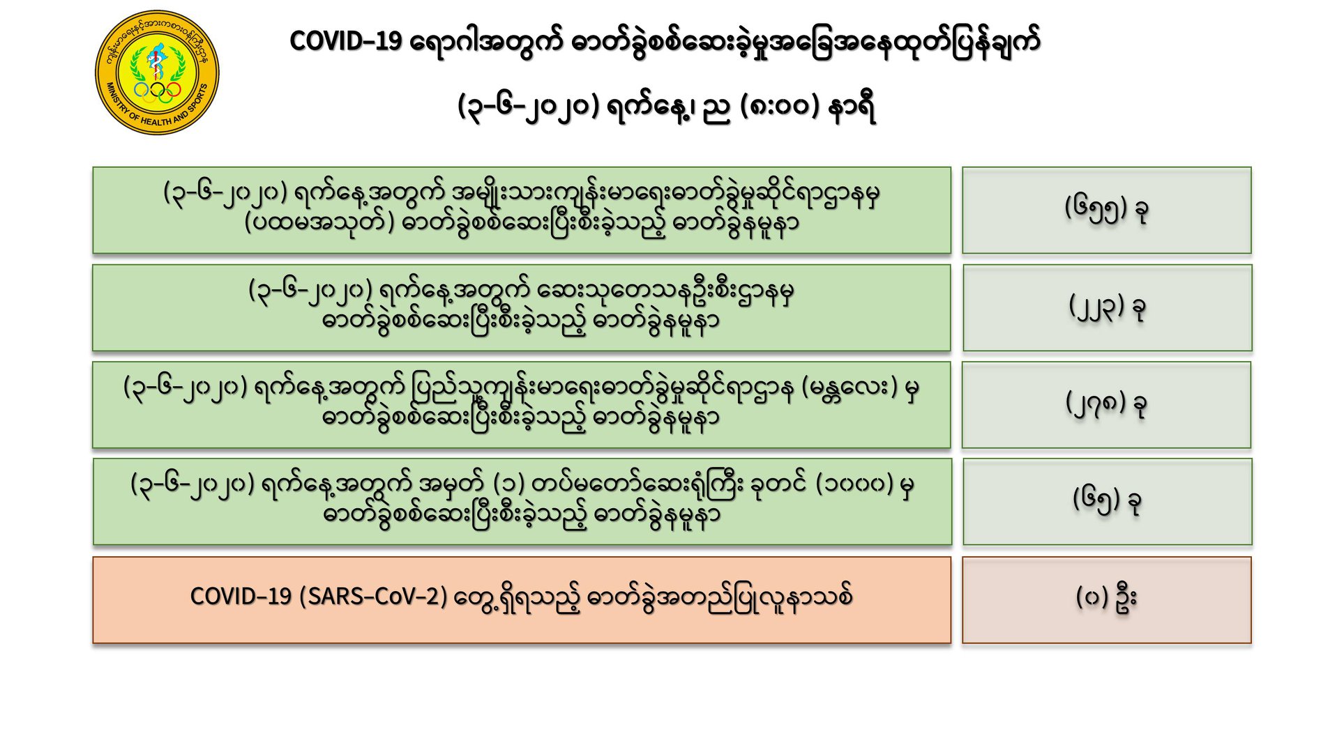 • COVID-19 ရောဂါ ဓာတ်ခွဲအတည်ပြု လူနာသစ် မတွေ့ရှိရပါ။