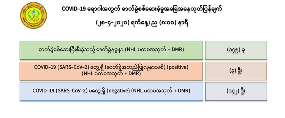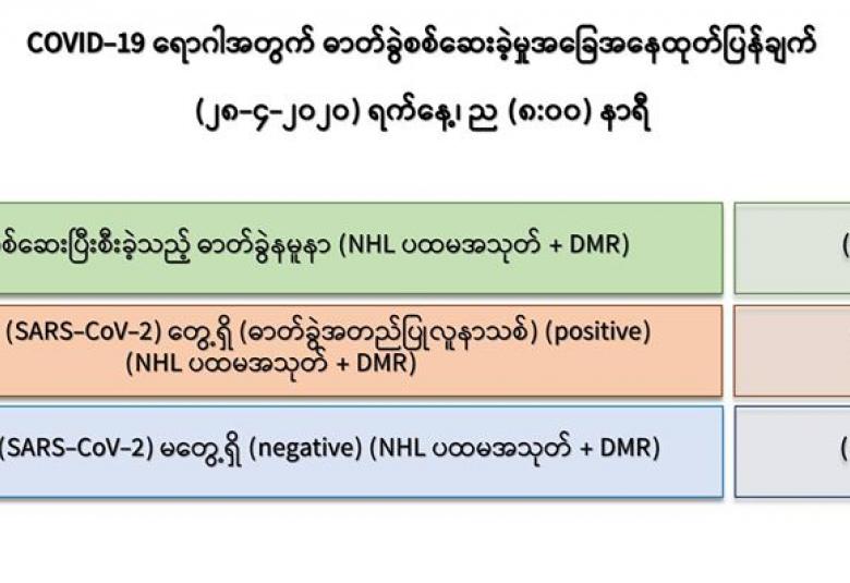 ၁။ (၂၈-၄-၂၀၂၀) ရက်နေ့၊ ညနေတွင် အမျိုးသားကျန်းမာရေးဓာတ်ခွဲမှုဆိုင်ရာဌာန (ရန်ကုန်) မှ (ပထမအသုတ်) အဖြစ်စစ်ဆေးပြီးစီးခဲ့သောဓာတ်ခွဲနမူနာ နှင့် ဆေးသုတေသနဦးစီးဌာန (DMR) မှ ဓာတ်ခွဲစစ်ဆေးပြီးစီးခဲ့သော ဓာတ်ခွဲနမူနာပေါင်း (၁၄၅) ခုအနက် -