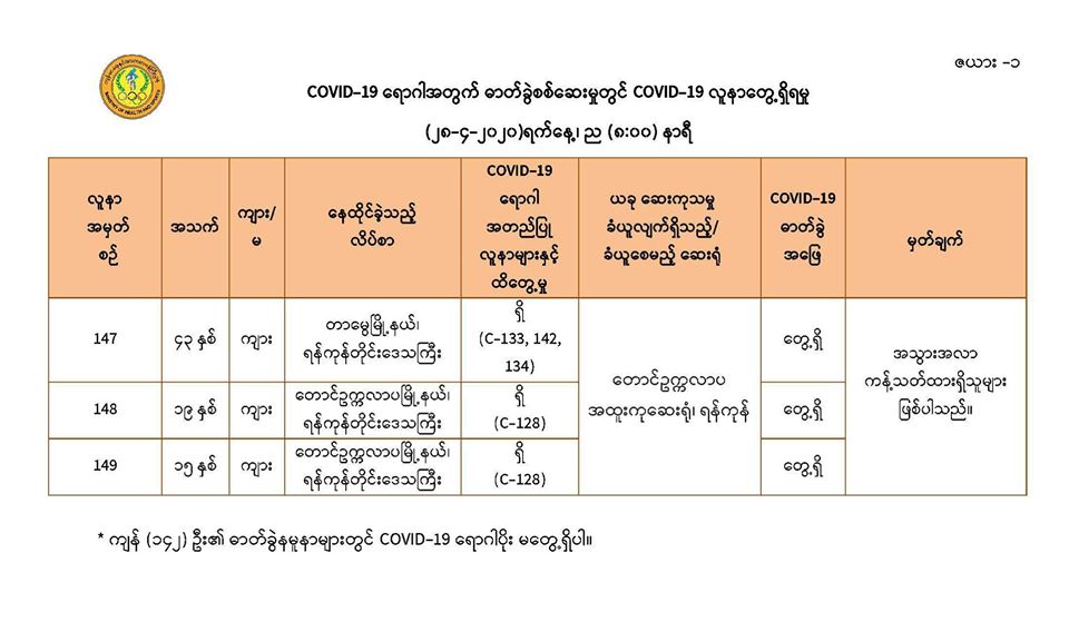 ၃။ ဓာတ်ခွဲနမူနာများတွင် (၂) ကြိမ် ဆက်တိုက် ပိုးမတွေ့ရှိသူ (၆) ဦး (လူနာအမှတ် - ၆၊ ၁၉၊ ၂၀၊ ၂၄၊ ၂၅၊ ၂၉) ထပ်မံ တွေ့ရှိသည်ဖြစ်၍ ယခုအခါ မြန်မာနိုင်ငံရှိ ဓာတ်ခွဲအတည်ပြုလူနာများ အနက် ရောဂါပိုးကင်းစင်သူ စုစုပေါင်း (၁၆) ဦးရှိပြီး ၎င်းတို့အား ဆေးရုံမှဆင်းခွင့်ပြုခဲ့ကာ အသွားအလာ ဆက်လက်ကန့်သတ်ထားရှိပါသည်။ ဓာတ်ခွဲအတည်ပြုလူနာများအနက် သေဆုံးသူ (၅)ဦးရှိပါသည်။