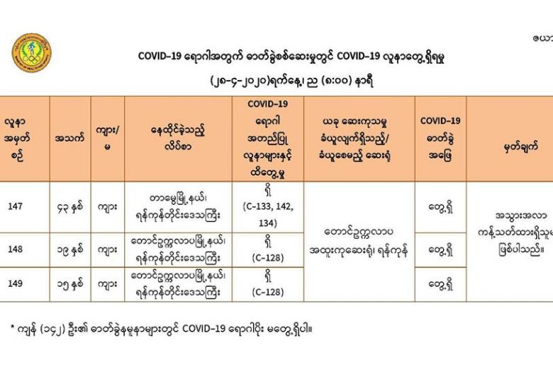 ၂။ သို့ဖြစ်ပါ၍ (၂၈-၄-၂၀၂၀)ရက်နေ့၊ ည (၈:၀၀) နာရီ အထိ မြန်မာနိုင်ငံတွင် ဓာတ်ခွဲအတည်ပြုလူနာ (၁၄၉)ဦး ရှိပြီဖြစ်ပါသည်။