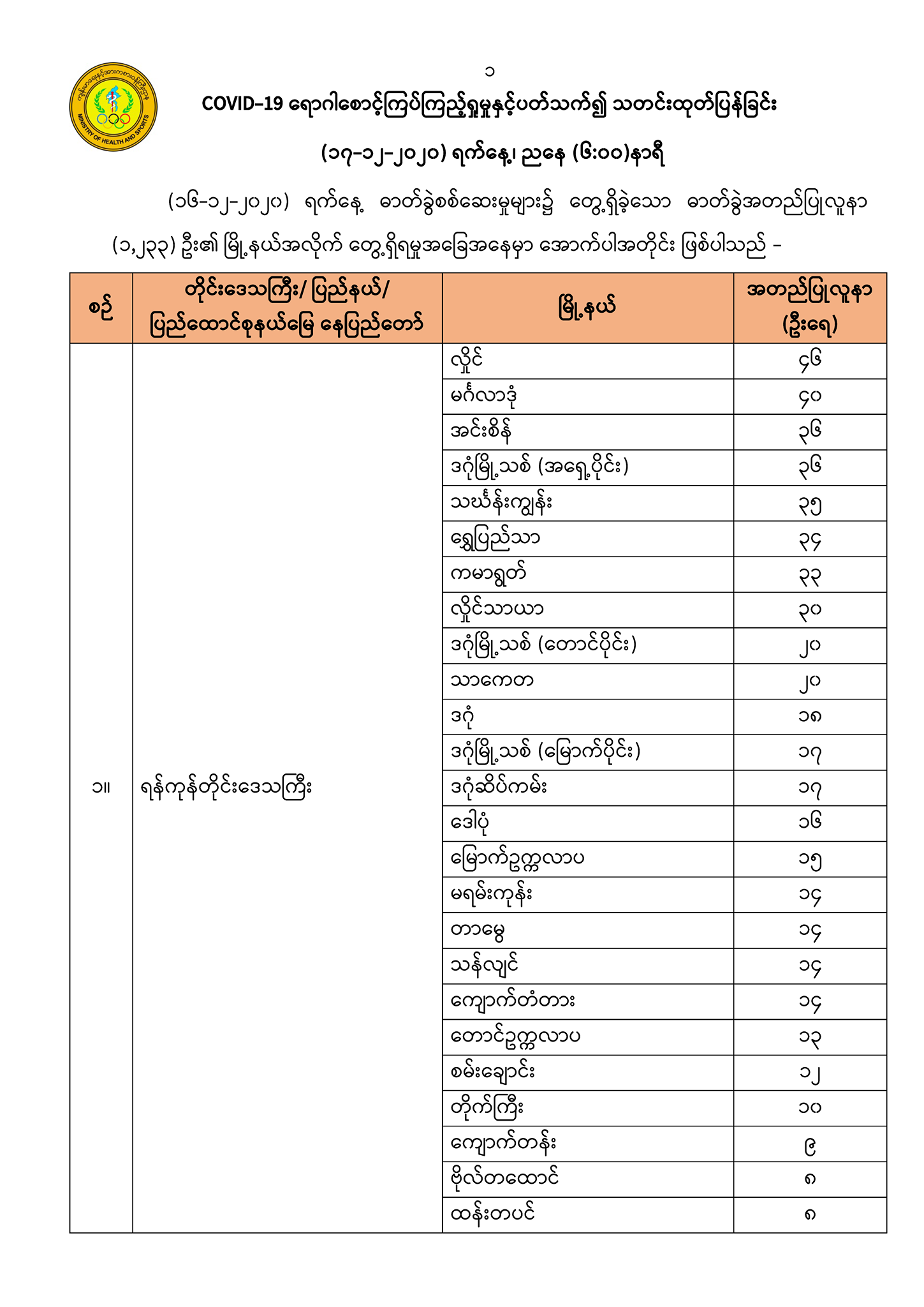 (၁၆-၁၂-၂၀၂၀) ရက်နေ့ ဓာတ်ခွဲစစ်ဆေးမှုများ၌ တွေ့ရှိခဲ့သော ဓာတ်ခွဲအတည်ပြုလူနာ (၁,၂၃၃) ဦး၏ မြို့နယ်အလိုက် တွေ့ရှိရမှုအခြေအနေမှာ အောက်ပါအတိုင်း ဖြစ်ပါသည်။