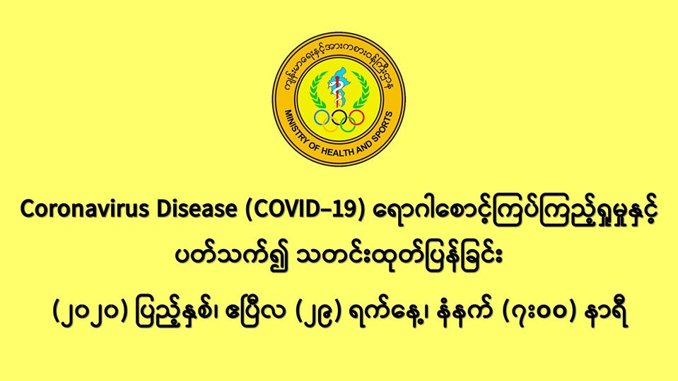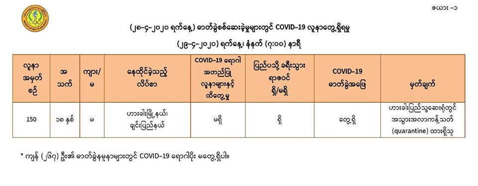 ၂။ သို့ဖြစ်ပါ၍ (၂၉-၄-၂၀၂၀) ရက်နေ့၊ နံနက် (၇:၀၀) နာရီအချိန်အထိ မြန်မာနိုင်ငံတွင် COVID-19 ရောဂါဓာတ်ခွဲအတည်ပြုလူနာ စုစုပေါင်း (၁၅၀) ဦး တွေ့ရှိခဲ့ပြီဖြစ်ပါသည်။