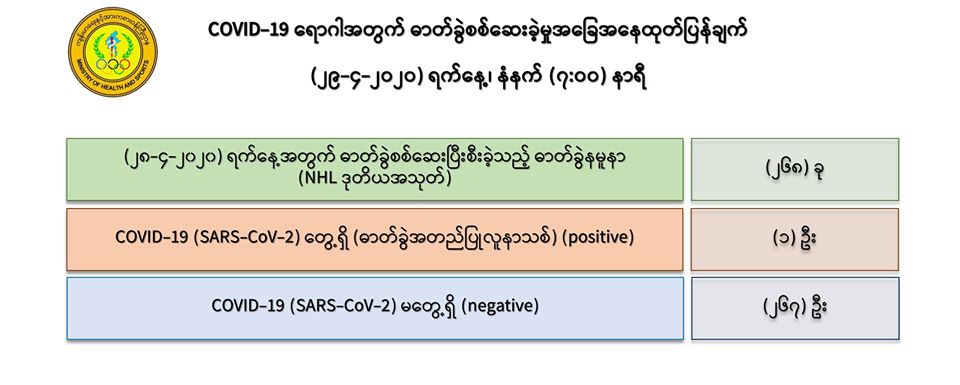 ၁။ (၂၉-၄-၂၀၂၀) ရက်နေ့၊ နံနက်အစောပိုင်းတွင် အမျိုးသားကျန်းမာရေးဓာတ်ခွဲမှုဆိုင်ရာဌာန (ရန်ကုန်) (NHL) မှ (၂၈-၄-၂၀၂၀ ရက် အတွက် ဒုတိယအသုတ်) ဓာတ်ခွဲစစ်ဆေးပြီးစီးခဲ့သော စောင့်ကြည့်လူနာနှင့် အသွားအလာကန့်သတ်ထားရှိသူများ၏ ဓာတ်ခွဲနမူနာ (၂၆၈) ခု၏ ဓာတ်ခွဲအဖြေများအနက် -