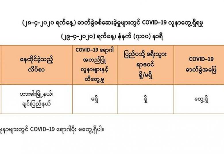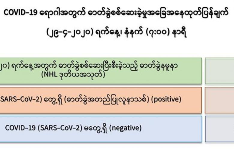 ၃။ အမျိုးသားကျန်းမာရေးဓာတ်ခွဲမှုဆိုင်ရာဌာန (ရန်ကုန်) (NHL) အနေဖြင့် ထိုသို့ စောင့်ကြည့်လူနာနှင့် အသွားအလာကန့်သတ်ထားရှိသူများ၏ ဓာတ်ခွဲနမူနာများအပြင် COVID-19 ဓာတ်ခွဲအတည်ပြု လူနာဟောင်း (old confirmed case) များ၏ ဓာတ်ခွဲနမူနာများအားလည်း ရယူကာ ပိုးကင်းစင်လာမှု အခြေအနေအား ပုံမှန် စစ်ဆေးလျက်ရှိပါသည်။