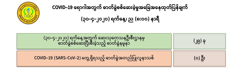 • COVID-19 ရောဂါ ဓာတ်ခွဲအတည်ပြု လူနာသစ် မတွေ့ရှိပါ။
