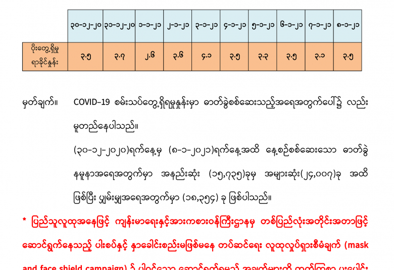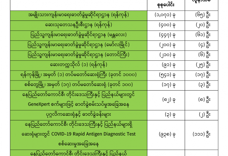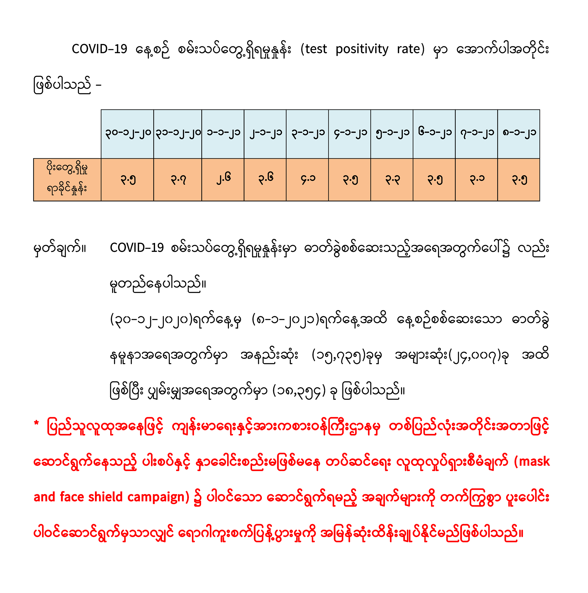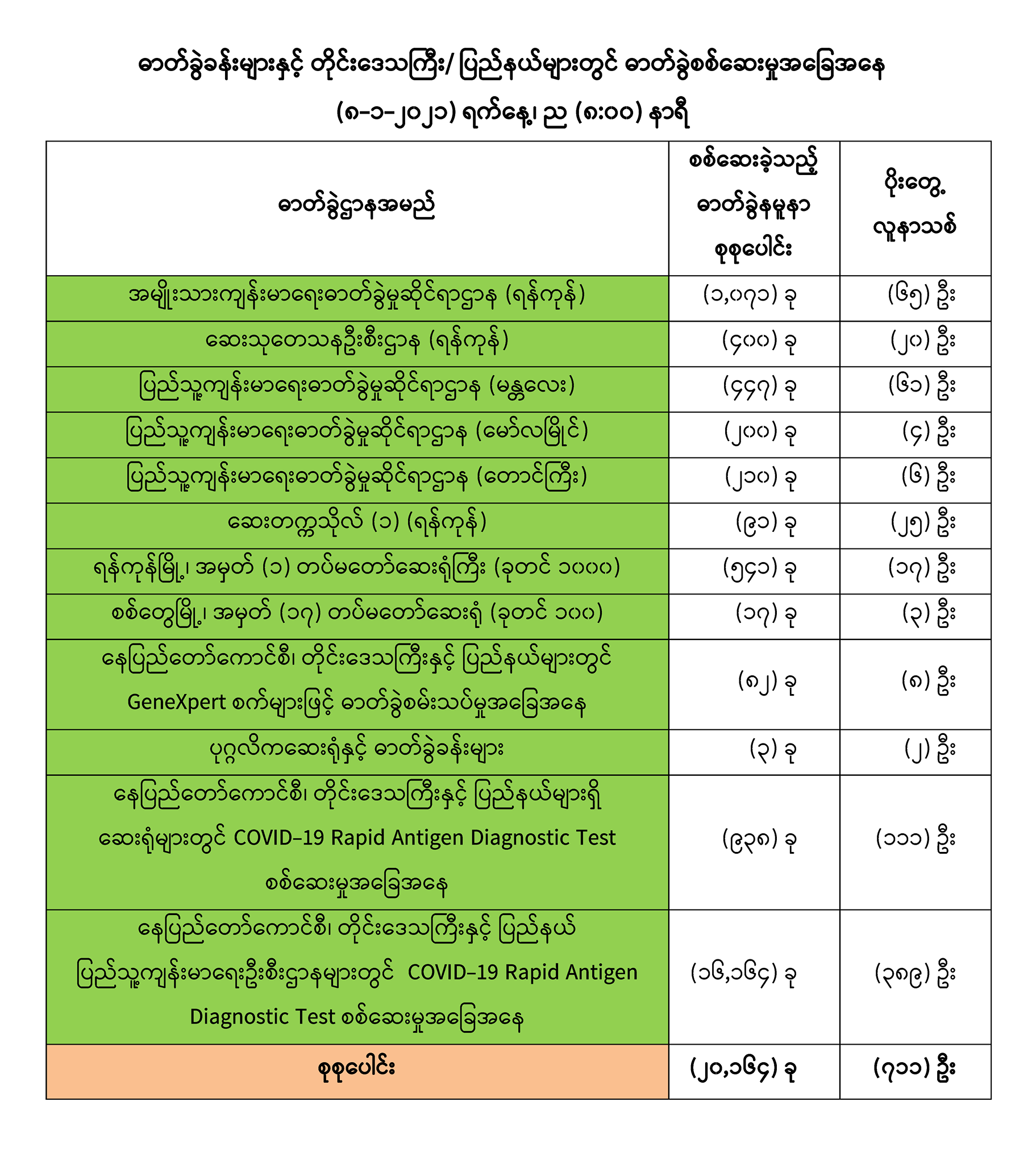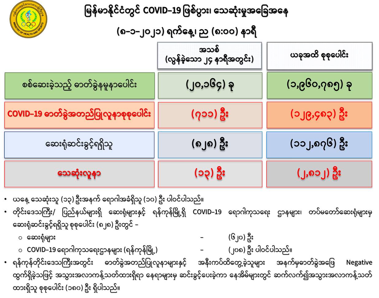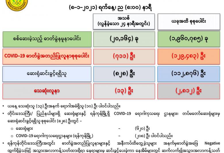 (၇-၁-၂၀၂၁) ရက်နေ့၊ ည (၈:၀၀) နာရီမှ (၈-၁-၂၀၂၁) ရက်နေ့၊ ည (၈:၀၀) နာရီ အတွင်း ဓာတ်ခွဲနမူနာ စုစုပေါင်း (၂၀,၁၆၄) ခုအား စစ်ဆေးပြီးစီးခဲ့ရာ COVID-19 ရောဂါ ဓာတ်ခွဲ အတည်ပြု လူနာသစ် (၇၁၁) ဦး တွေ့ရှိရပါသည်။