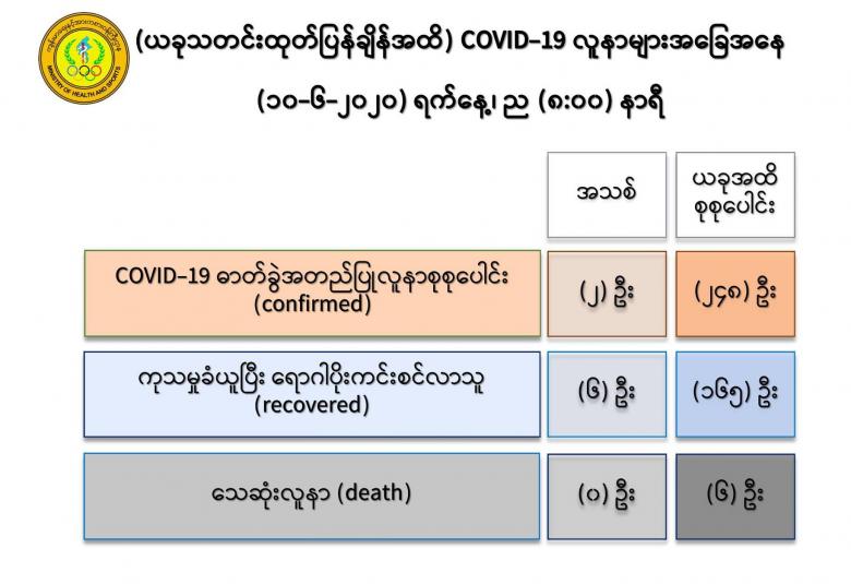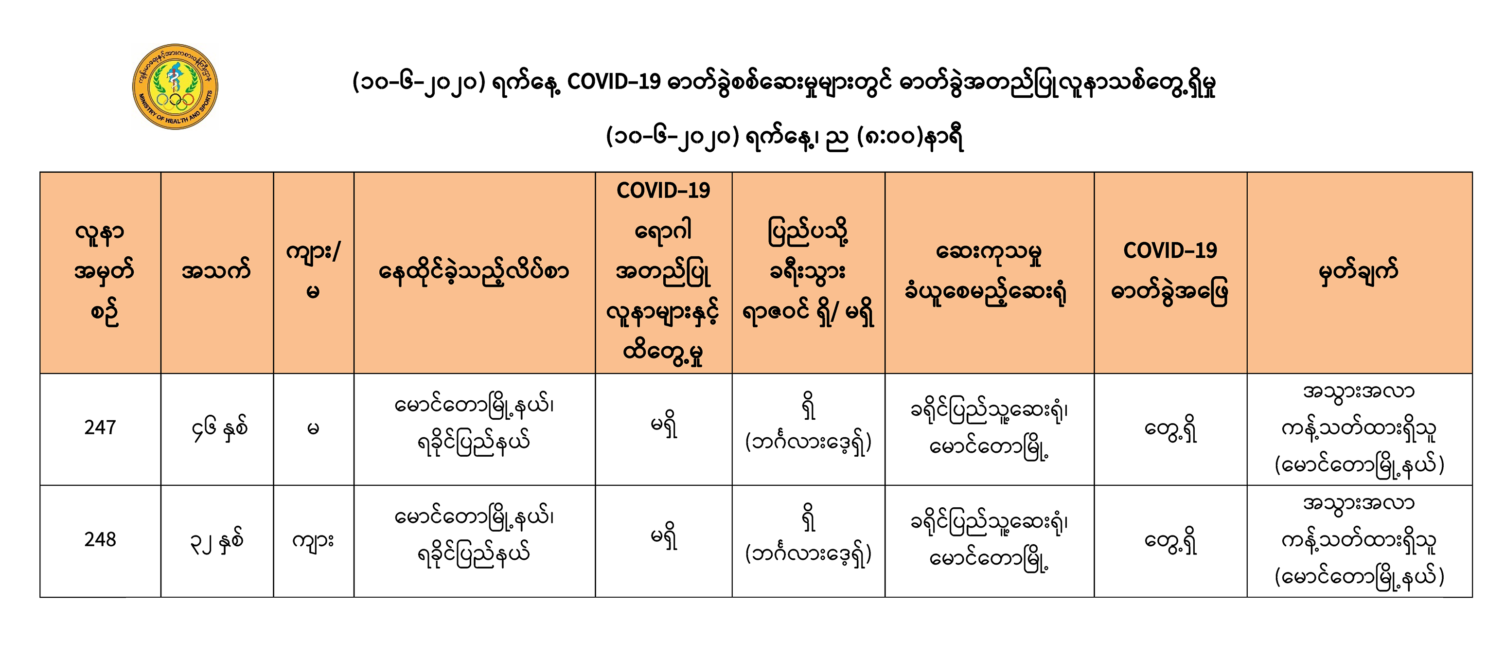 ၂။ (၁၀-၆-၂၀၂၀) ရက်နေ့၊ ည (၈:ဝ၀)နာရီအထိ မြန်မာနိုင်ငံတွင် COVID-19 ရောဂါ ဓာတ်ခွဲ အတည်ပြုလူနာ (၂၄၈) ဦးရှိပါသည်။