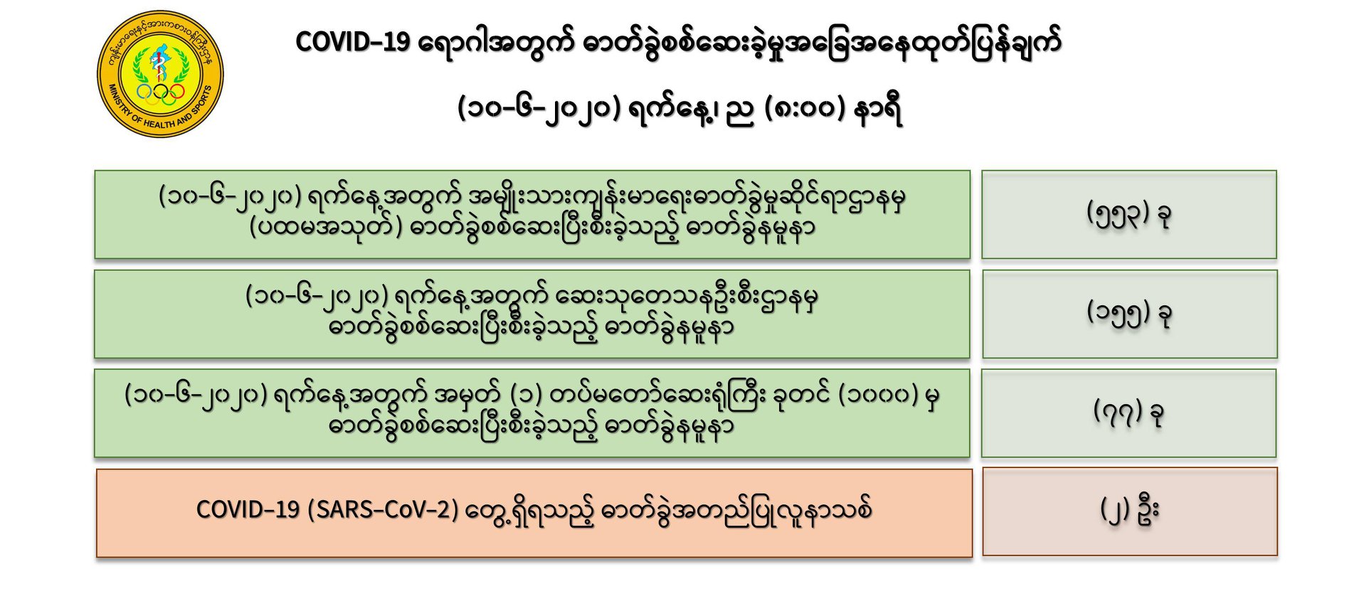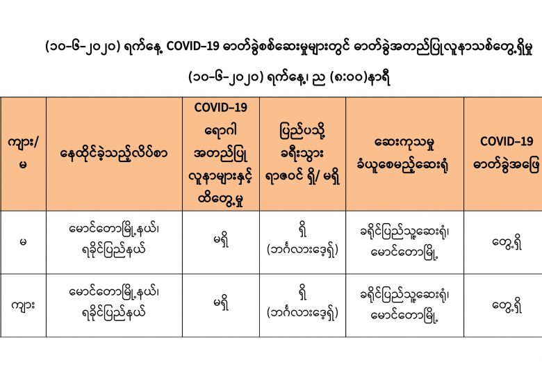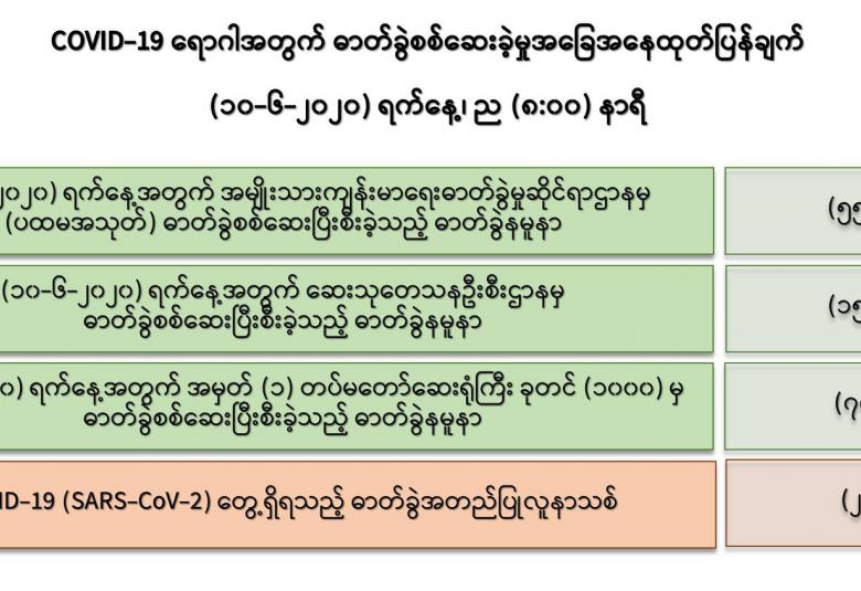 ၁။ (၁၀-၆-၂၀၂၀) ရက်နေ့အတွက် COVID-19 ဓာတ်ခွဲစစ်ဆေးရာတွင် -