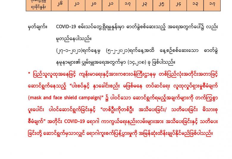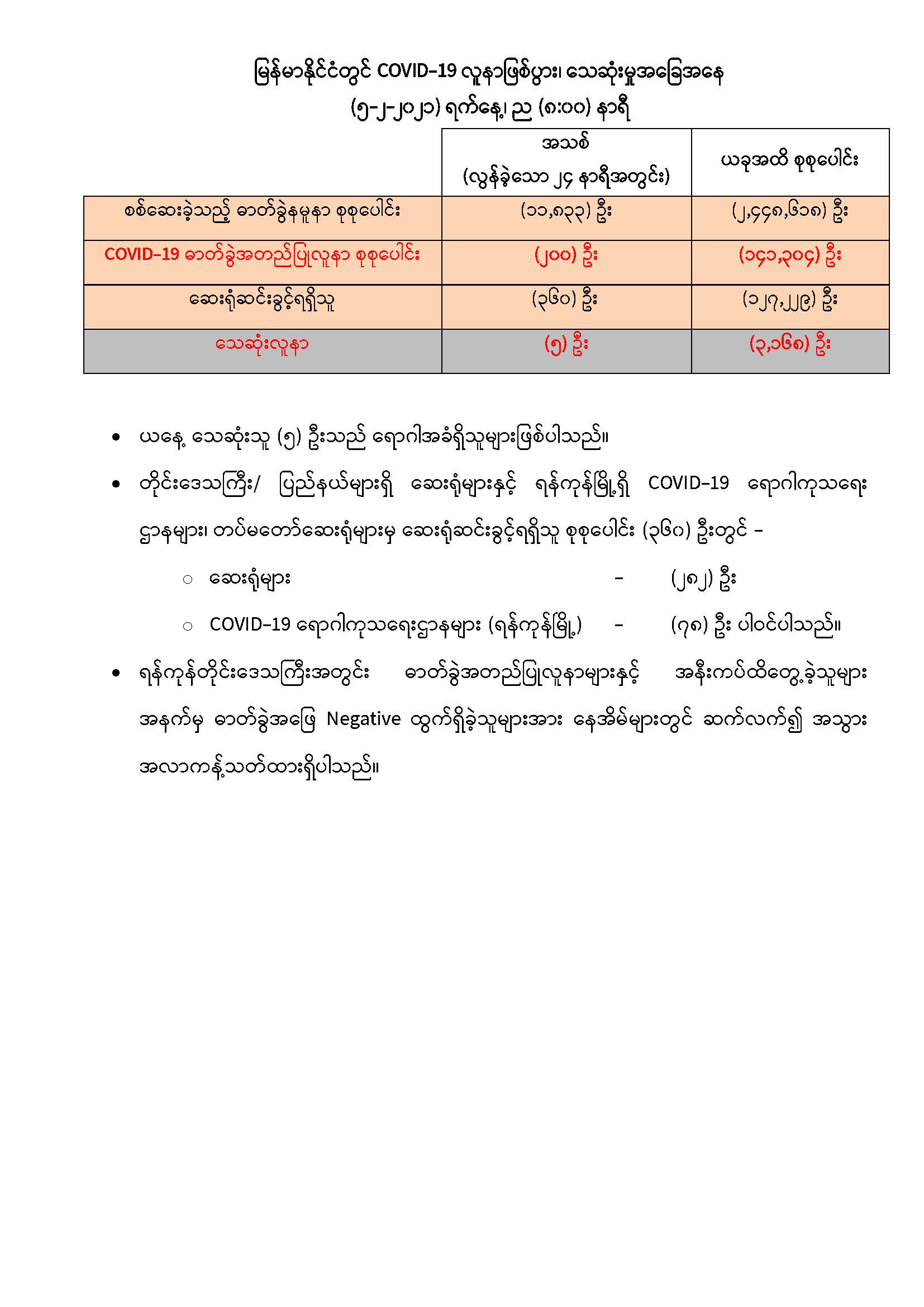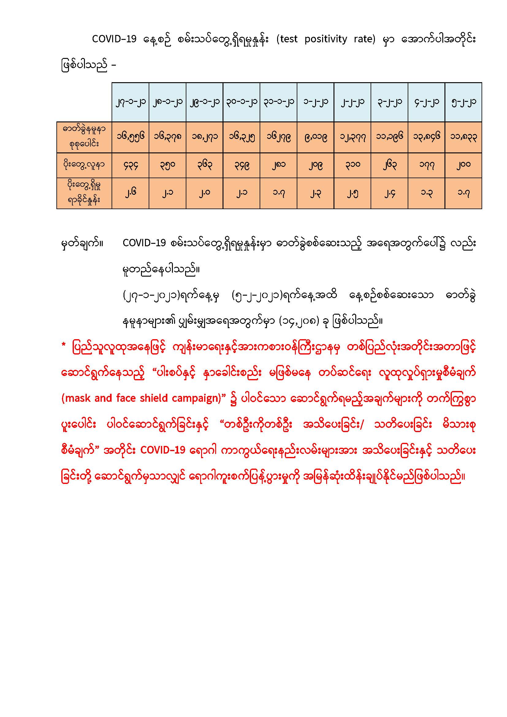 (၄-၂-၂၀၂၁)ရက်နေ့၊ ည (၈:၀၀)နာရီမှ (၅-၂-၂၀၂၁)ရက်နေ့၊ ည (၈:၀၀)နာရီအတွင်း ဓာတ်ခွဲ နမူနာစုစုပေါင်း (၁၁,၈၃၃) ခုအား စစ်ဆေးပြီးစီးခဲ့ရာ COVID-19 ရောဂါဓာတ်ခွဲအတည်ပြု လူနာသစ် (၂၀၀) ဦး တွေ့ရှိရပါသည်။