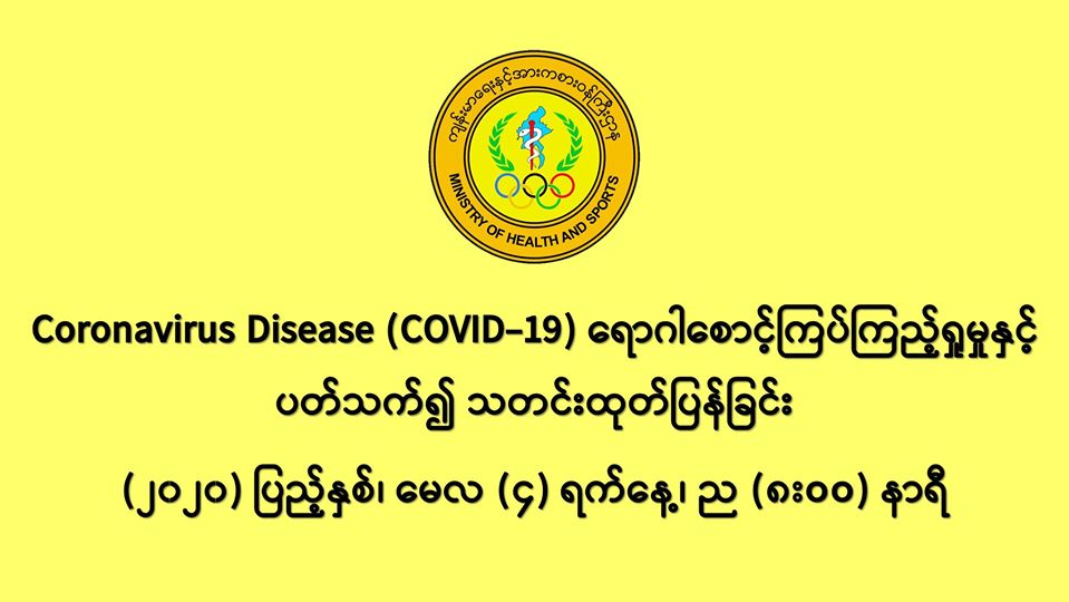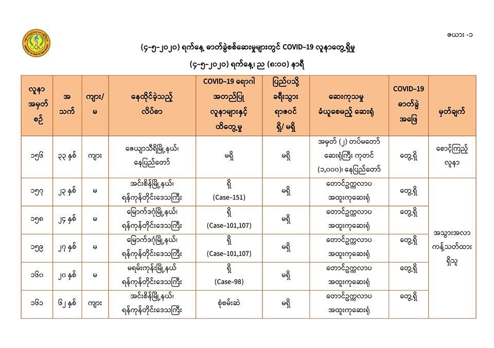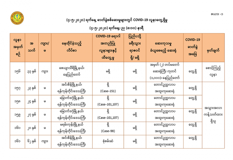 ၁။ (၄-၅-၂၀၂၀) ရက်နေ့၊ ညနေပိုင်းတွင် အမျိုးသားကျန်းမာရေးဓာတ်ခွဲမှုဆိုင်ရာဌာန (ရန်ကုန်) မှ (ပထမ + ဒုတိယအသုတ်) စစ်ဆေးပြီးစီးခဲ့သော ဓာတ်ခွဲနမူနာ (၁၅၂) ခုနှင့် ဆေးသုတေသနဦးစီးဌာန မှ စစ်ဆေး ပြီးစီးခဲ့သော ဓာတ်ခွဲနမူနာ (၁၁၉) ခု၊ စုစုပေါင်း (၂၇၁) ခုတွင် -