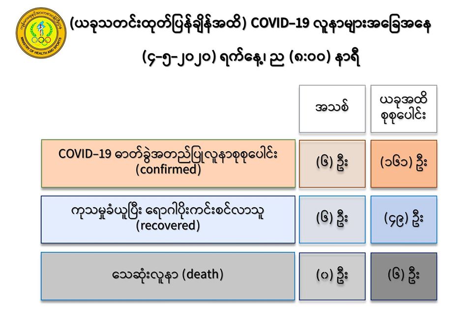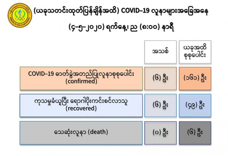 ၂။ (၄-၅-၂၀၂၀) ရက်နေ့၊ ည (၈:၀၀)နာရီအထိ မြန်မာနိုင်ငံတွင် COVID-19 ရောဂါ ဓာတ်ခွဲ အတည်ပြုလူနာ (၁၆၁) ဦးရှိပြီဖြစ်ပါသည်။