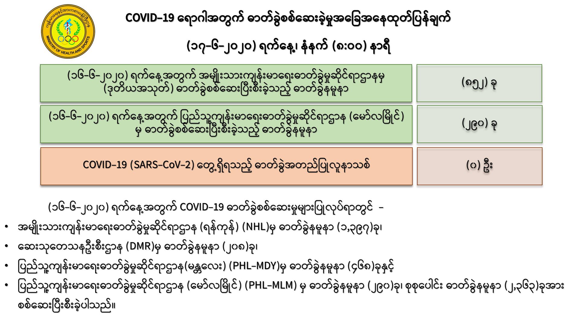 ၁။ (၁၆-၆-၂၀၂၀)ရက်နေ့အတွက် အမျိုးသားကျန်းမာရေးဓာတ်ခွဲမှုဆိုင်ရာဌာန(ရန်ကုန်) (NHL) မှ ထပ်မံစစ်ဆေးပြီးခဲ့သော ဓာတ်ခွဲနမူနာ (၈၅၂)ခုနှင့် ပြည်သူ့ကျန်းမာရေးဓာတ်ခွဲမှုဆိုင်ရာဌာန (မော်လမြိုင်)မှ ဓာတ်ခွဲနမူနာ (၂၉၀)ခု၊ စုစုပေါင်း (၁,၁၄၂) ခုတွင်-
