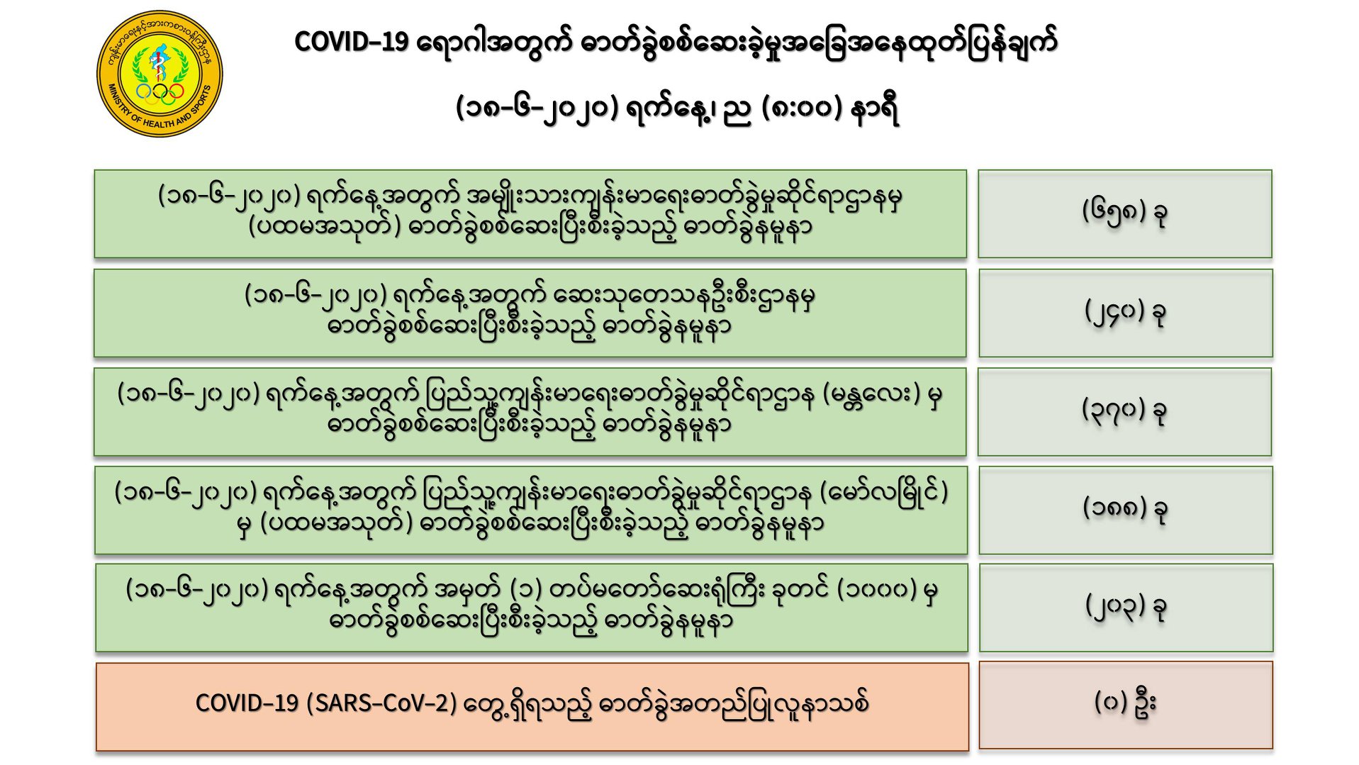 - အမျိုးသားကျန်းမာရေးဓာတ်ခွဲမှုဆိုင်ရာဌာန (ရန်ကုန်) (NHL) မှ (ပထမအသုတ်) ဓာတ်ခွဲ နမူနာ (၆၅၈)ခု၊