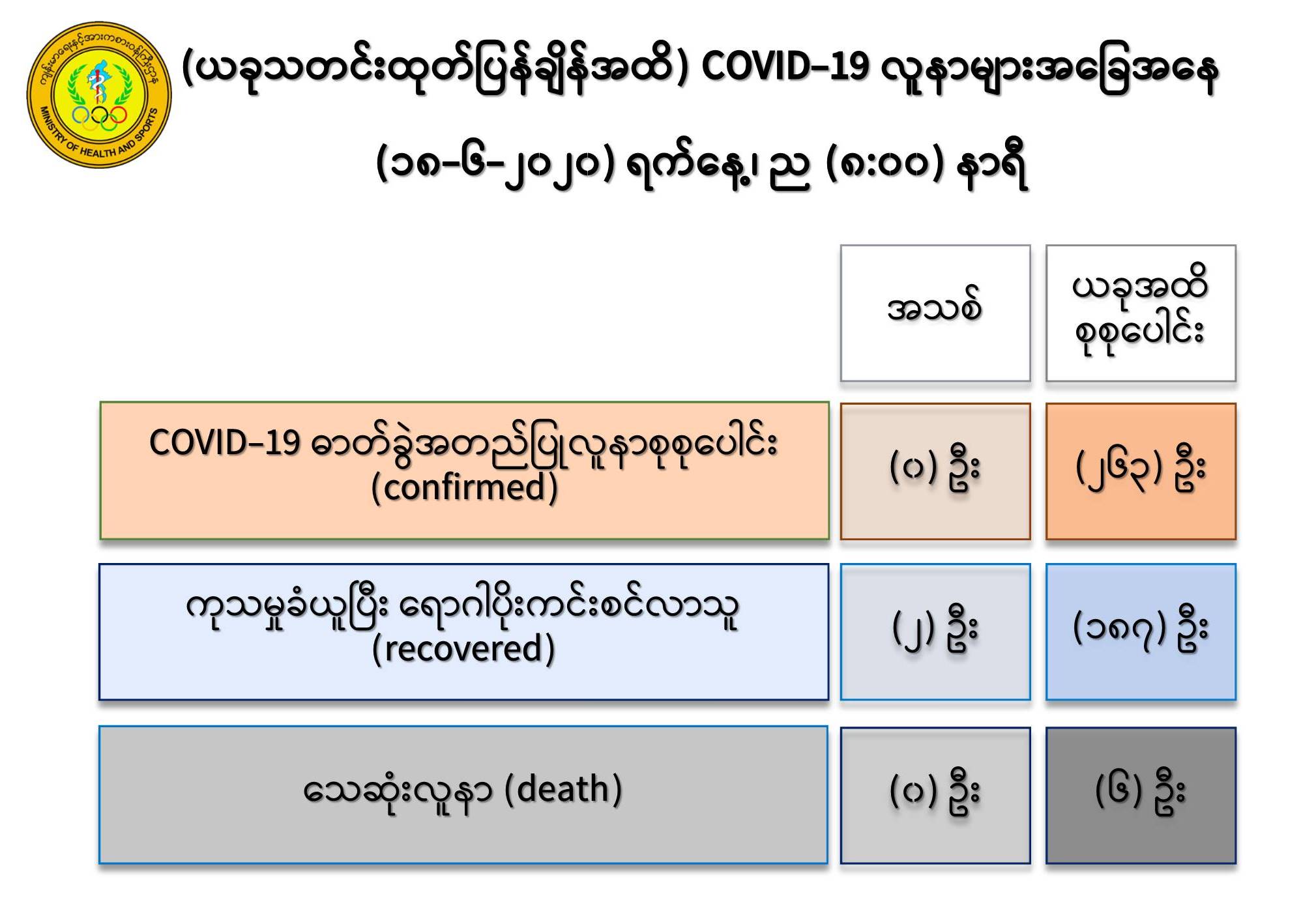 ၂။ (၁၈-၆-၂၀၂၀) ရက်နေ့၊ ည (၈:၀၀)နာရီအထိ မြန်မာနိုင်ငံတွင် COVID-19 ရောဂါ ဓာတ်ခွဲ အတည်ပြုလူနာ (၂၆၃) ဦးရှိပါသည်။