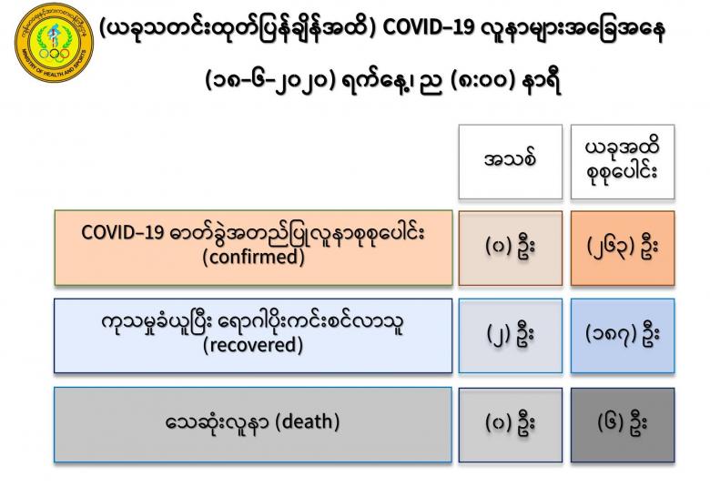 ၃။ ဓာတ်ခွဲအတည်ပြု လူနာဟောင်း (old confirmed case) များ၏ ဓာတ်ခွဲနမူနာစစ်ဆေးမှုတွင် (၂) ကြိမ်ဆက်တိုက် ပိုးမတွေ့ရှိသူ အသစ် (၂) ဦး (Case - 133 နှင့် 231) ရှိသဖြင့် ယနေ့၊ ည (၈:၀၀) နာရီအထိ COVID-19 ရောဂါပိုးကင်းစင်လာသူ စုစုပေါင်း (၁၈၇) ဦးရှိပါသည်။ ၎င်းတို့အနက် (၁၇၂) ဦးအား ဆေးရုံမှဆင်းခွင့်ပြုခဲ့ပြီး ဖြစ်ကာ သတ်မှတ်နေရာများတွင် အသွားအလာ ဆက်လက်ကန့်သတ်၍ စောင့်ကြပ်ကြည့်ရှုလျက်ရှိ ပါသည်။