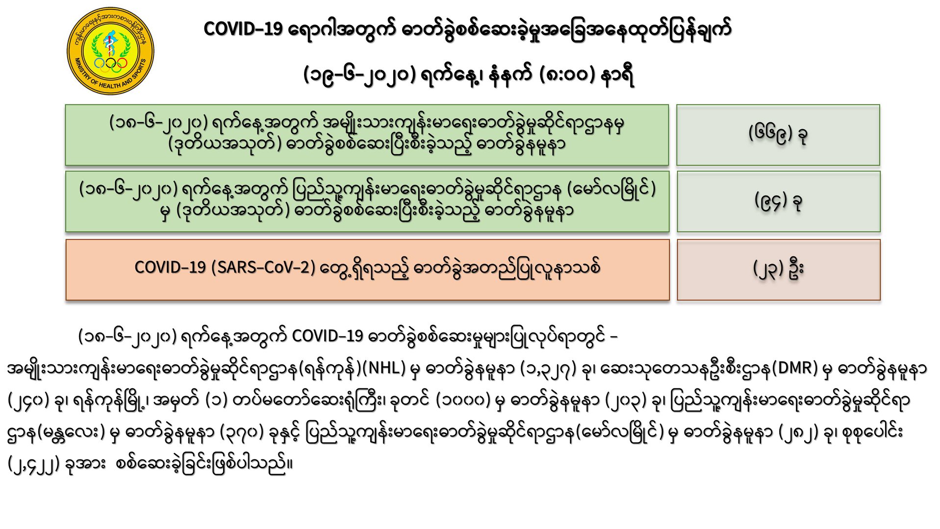 ၃။ (၁၈-၆-၂၀၂၀) ရက်နေ့အတွက် COVID-19 ရောဂါ ဓာတ်ခွဲစစ်ဆေးရာတွင် -