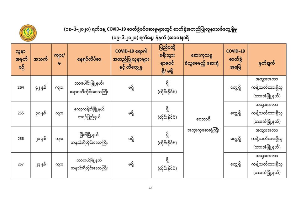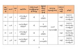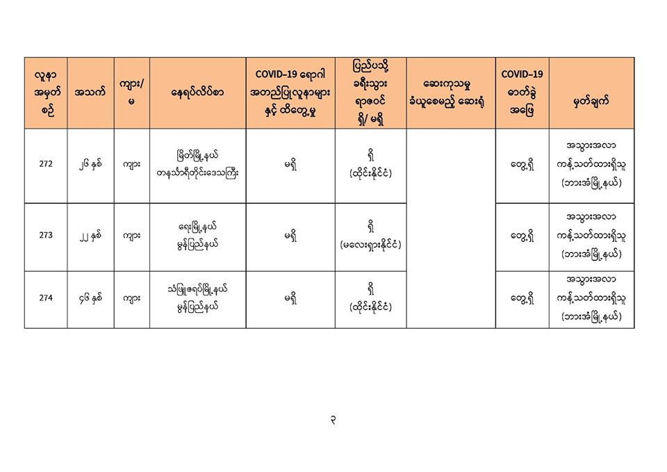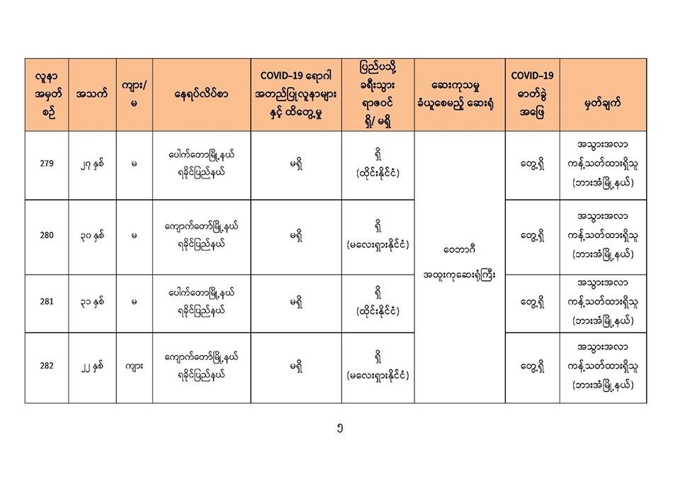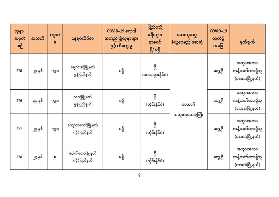 ၄။ အဆိုပါ COVID-19 ရောဂါ ဓာတ်ခွဲအတည်ပြုလူနာသစ် (၂၃) ဦးအား သက်ဆိုင်ရာ သတ်မှတ်ဆေးရုံများတွင် ဆက်လက်၍ ကုသမှုပေးရန် စီစဉ်ဆောင်ရွက်လျက်ရှိပါသည်။