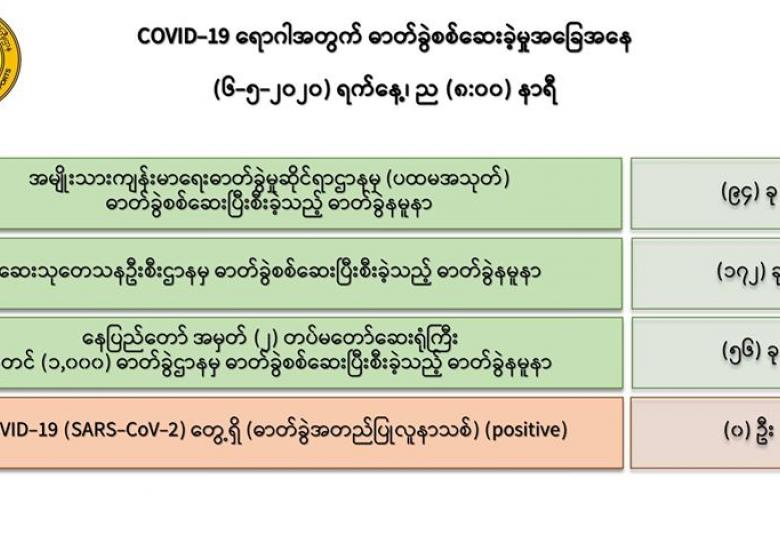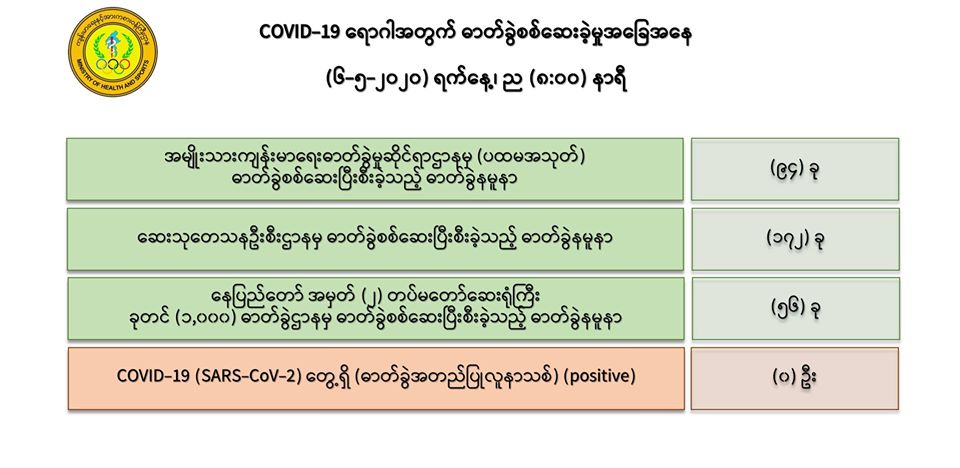 ၁။ (၆-၅-၂၀၂၀) ရက်နေ့၊ ညနေပိုင်းတွင် အမျိုးသားကျန်းမာရေးဓာတ်ခွဲမှုဆိုင်ရာဌာနမှ (ပထမအသုတ်) ဓာတ်ခွဲစစ်ဆေးပြီးစီးခဲ့သည့် ဓာတ်ခွဲနမူနာ (၉၄) ခု၊ ဆေးသုတေသနဦးစီးဌာန မှ စစ်ဆေးပြီးစီး ခဲ့သော ဓာတ်ခွဲနမူနာ (၁၇၂) ခုနှင့် အမှတ် (၂) တပ်မတော်ဆေးရုံကြီး ခုတင် (၁,၀၀၀) နေပြည်တော်မှ စစ်ဆေးပြီးစီးခဲ့သော ဓာတ်ခွဲနမူနာ (၅၆) ခု၊ စုစုပေါင်း (၃၂၂) ခုတွင် -