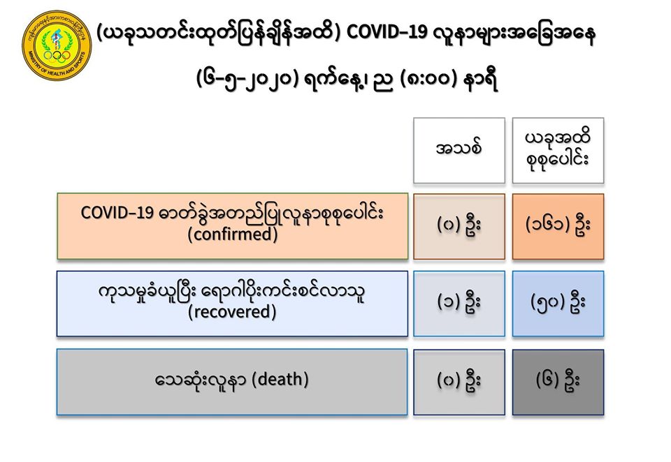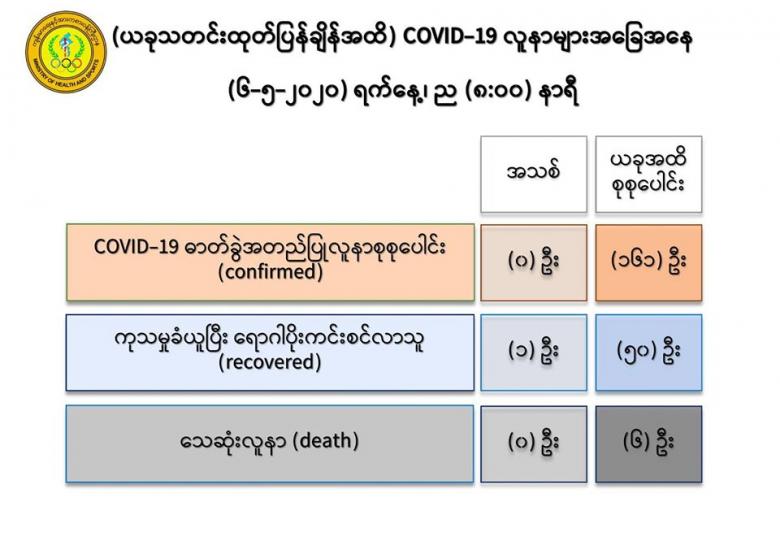 ၂။ (၆-၅-၂၀၂၀) ရက်နေ့၊ ည (၈:၀၀)နာရီအထိ မြန်မာနိုင်ငံတွင် COVID-19 ရောဂါဓာတ်ခွဲ အတည်ပြုလူနာ (၁၆၁) ဦးရှိပြီ ဖြစ်ပါသည်။