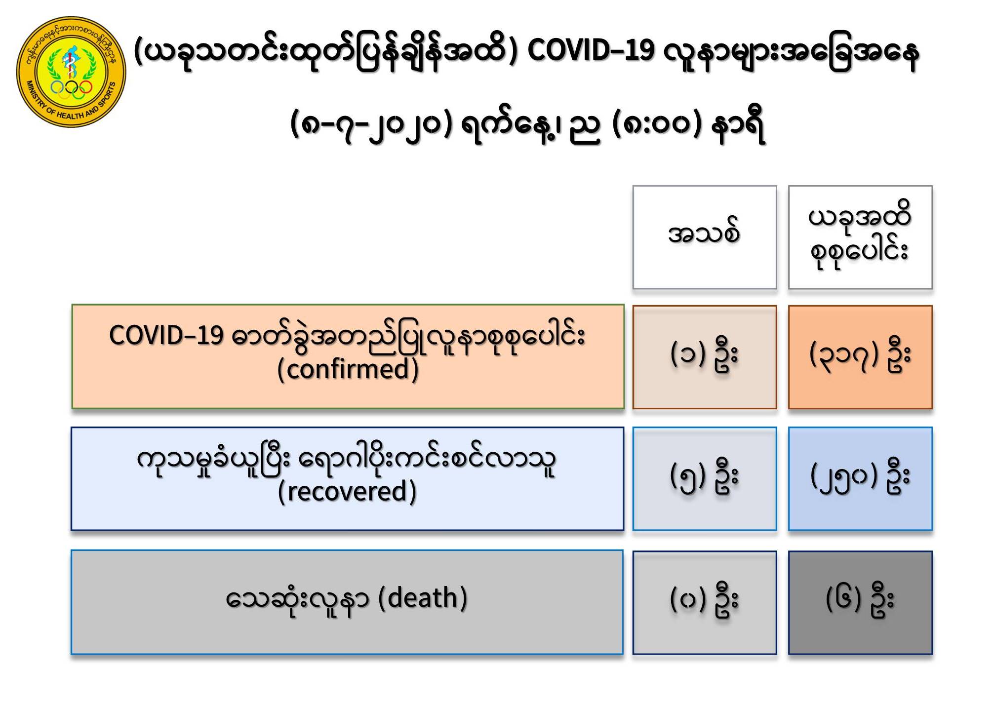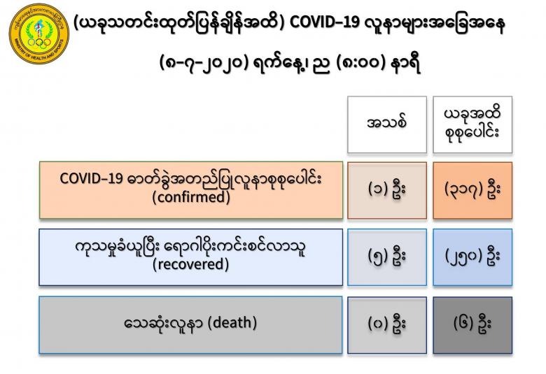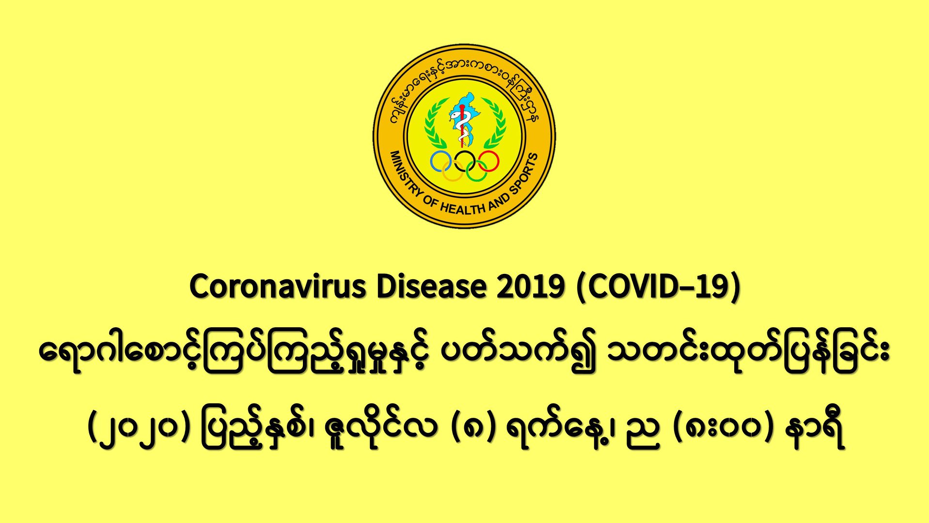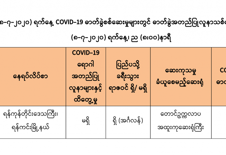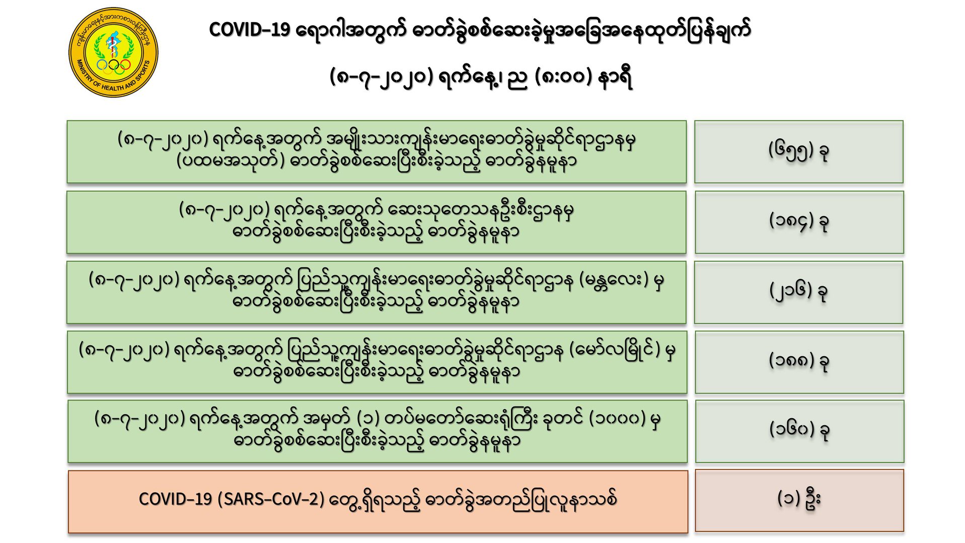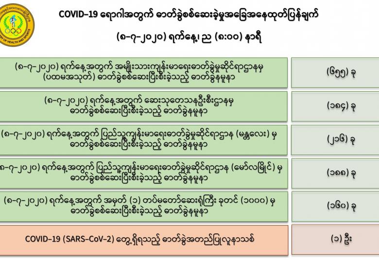 ၁။ (၈-၇-၂၀၂၀) ရက်နေ့အတွက် COVID-19 ရောဂါ ဓာတ်ခွဲစစ်ဆေးရာတွင် -