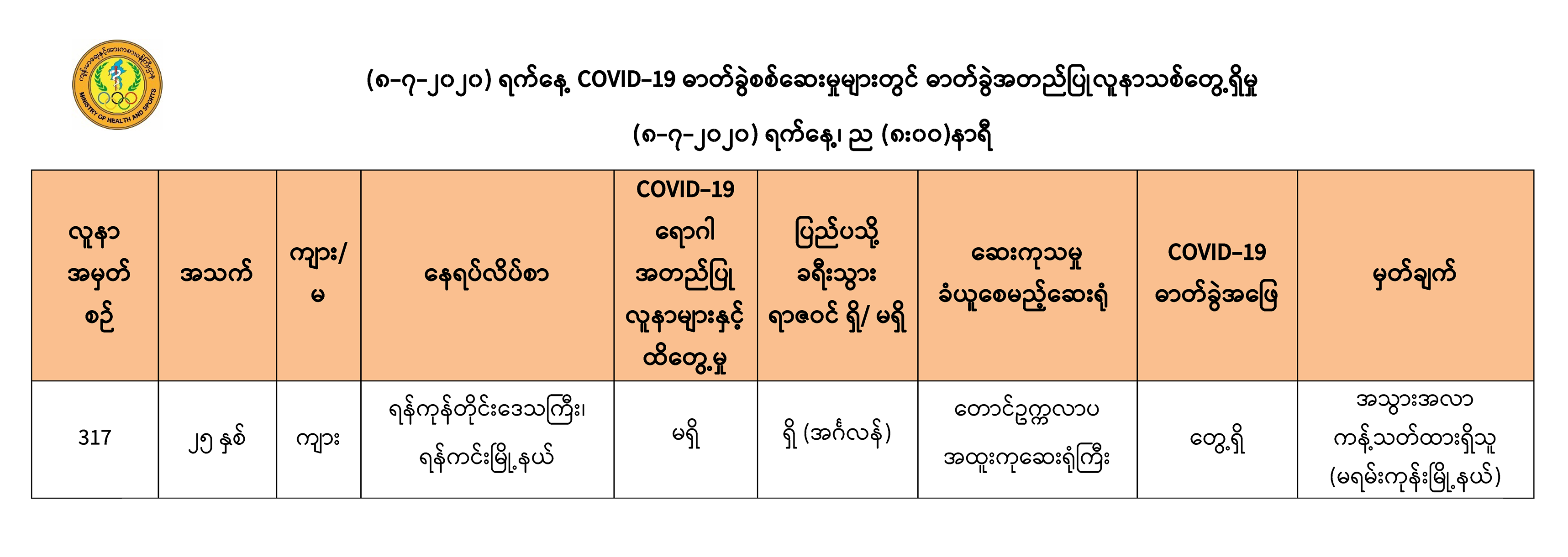 ၂။ (၈-၇-၂၀၂၀) ရက်နေ့၊ ည (၈:ဝ၀)နာရီအထိ မြန်မာနိုင်ငံတွင် COVID-19 ရောဂါဓာတ်ခွဲ အတည်ပြုလူနာ (၃၁၇) ဦးရှိပါသည်။