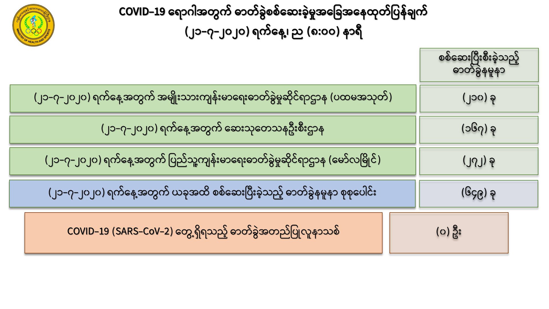 ၁။ (၂၁-၇-၂၀၂၀) ရက်နေ့အတွက် COVID-19 ရောဂါ ဓာတ်ခွဲစစ်ဆေးရာတွင် -