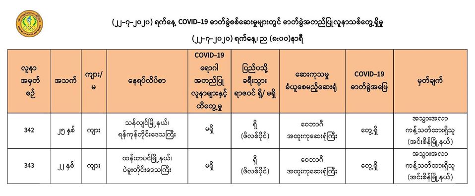 ၂။ (၂၂-၇-၂၀၂၀) ရက်နေ့၊ ည (၈:၀၀)နာရီအထိ မြန်မာနိုင်ငံတွင် COVID-19 ရောဂါဓာတ်ခွဲ အတည်ပြုလူနာ (၃၄၃) ဦးရှိပါသည်။